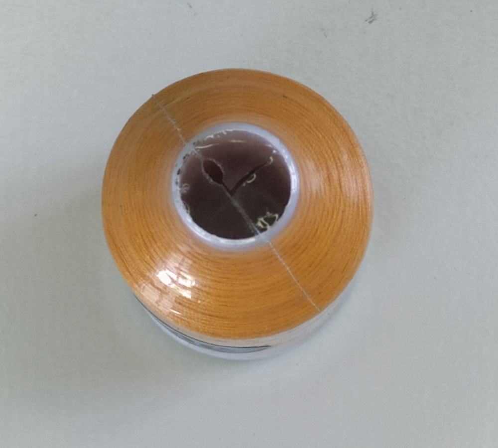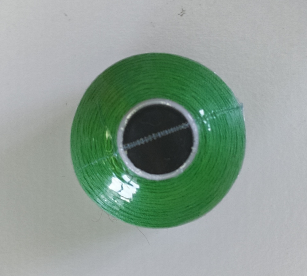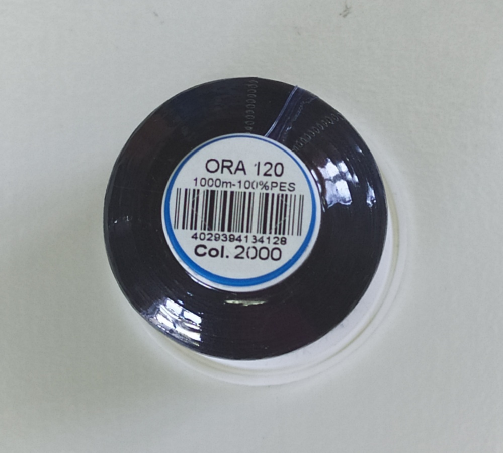 Rolo de linha de costura preta com etiqueta com informações de produto.