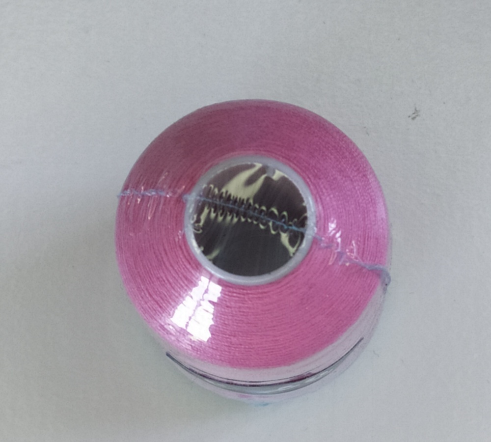 Rolo de linha cor-de-rosa embalado em plástico sobre superfície branca