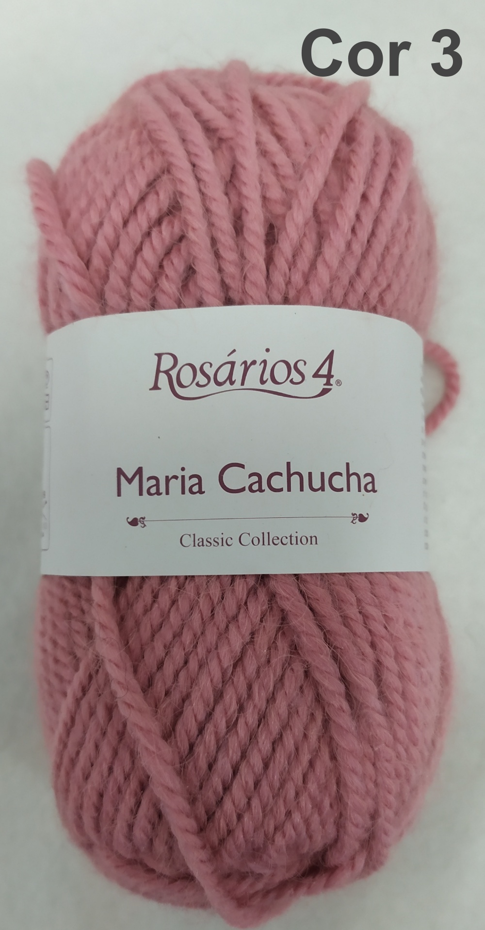 Novelo de lã rosa da Rosários 4 com etiqueta branca e texto 'Cor 3'.