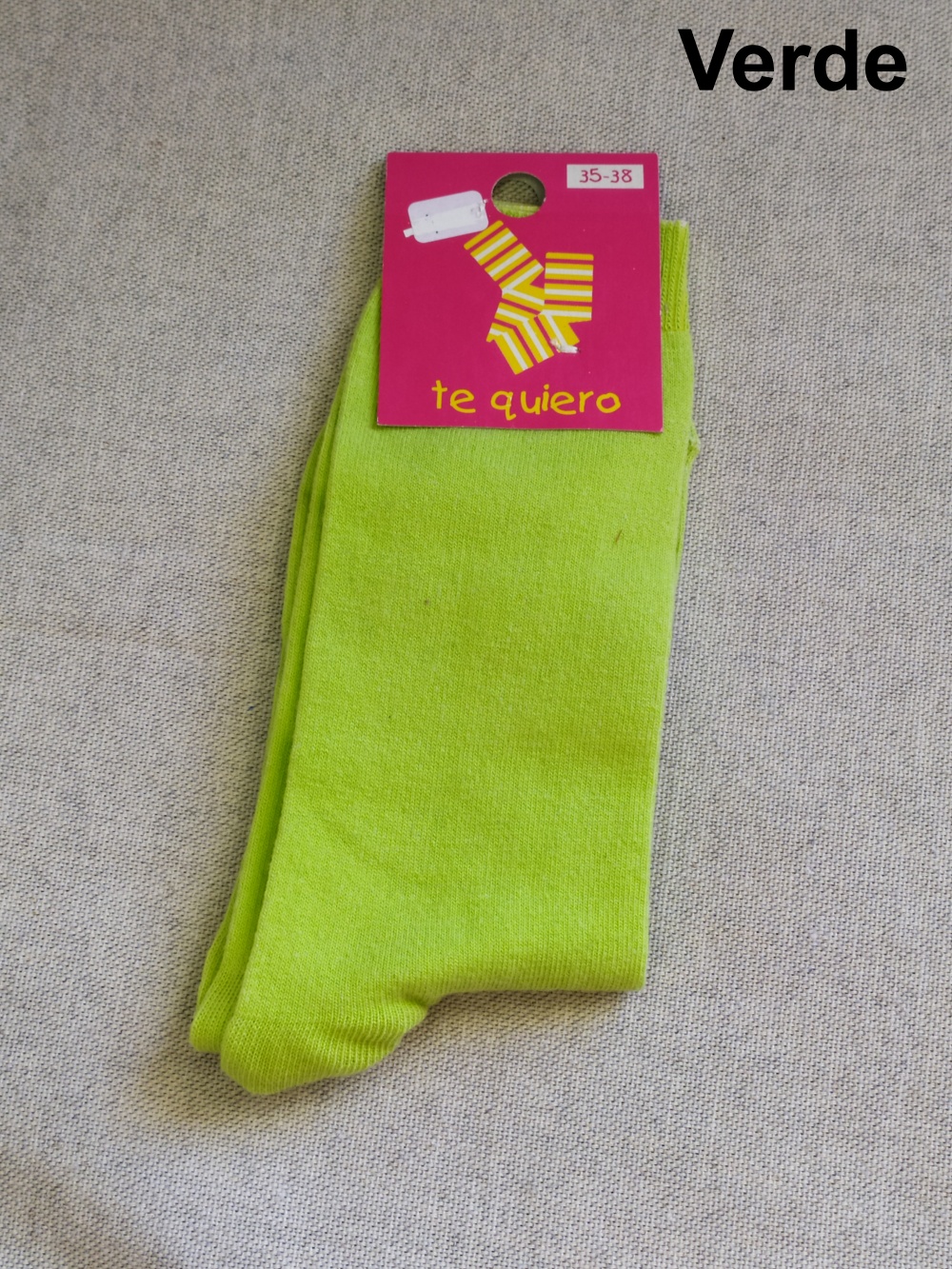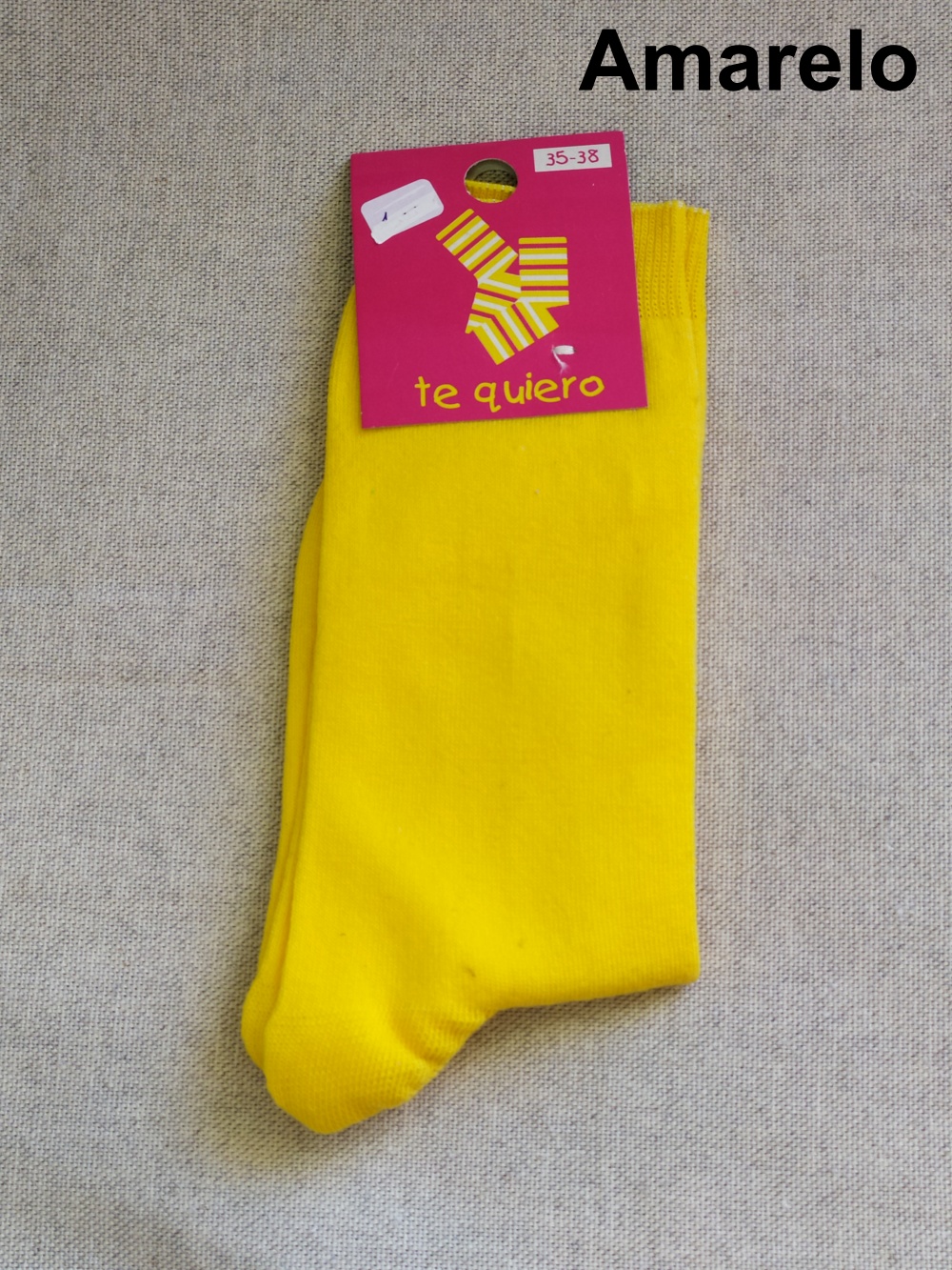 Meias amarelas com etiqueta rosa 'te quiero' tamanho 35-38 sobre superfície cinzenta