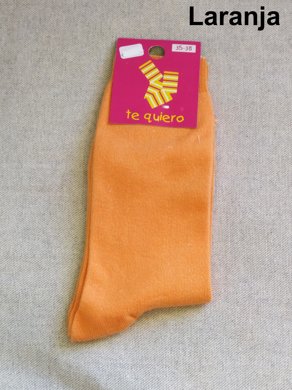 Meias de cor laranja com etiqueta rosa 'te quiero'