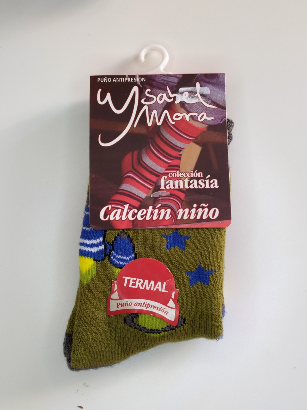 Meias térmicas verdes para criança com estampado de foguete e estrelas, embalagem Ysabel Mora