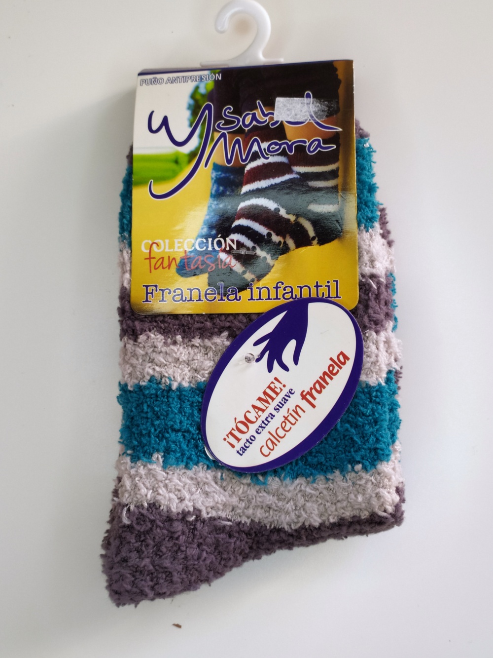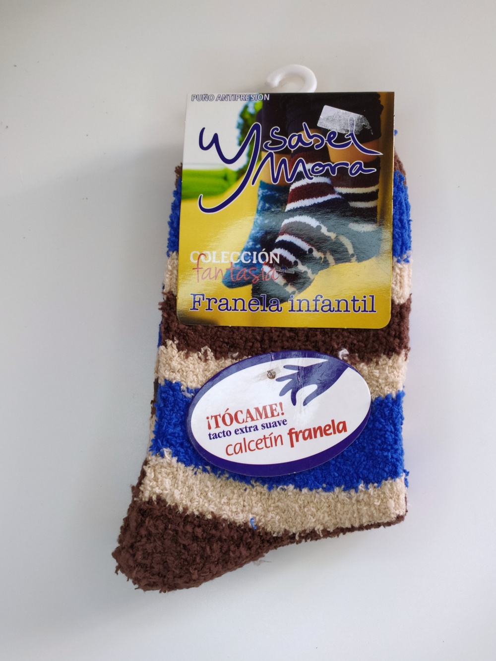 Meias de flanela infantil riscas azul, castanho e bege com etiquetas Ysabel Mora
