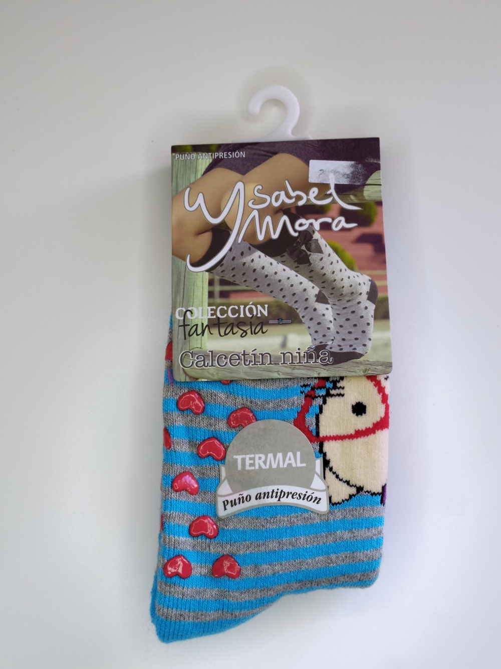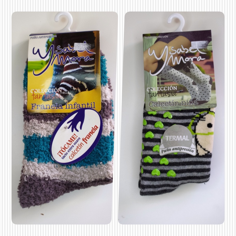 Dois pares de meias infantis térmicas da Ysabel Mora com padrões em riscas e pontos, textura de flanela, embalados com etiquetas e gancho