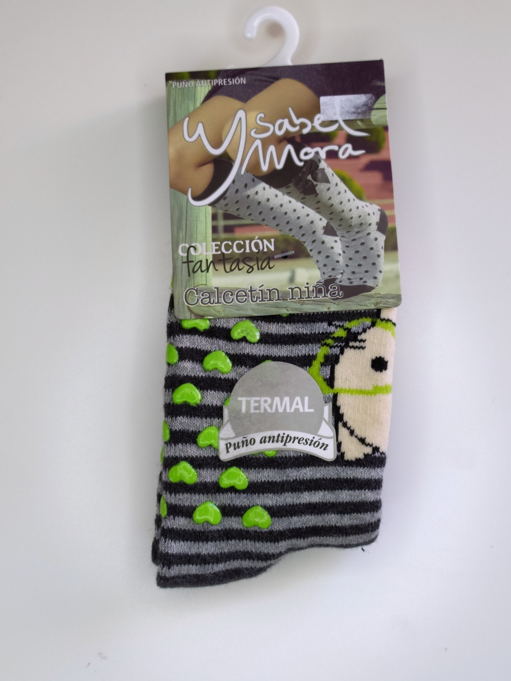 Meias Isabel Mora térmicas com corações verdes antiderrapantes e punho antiperpisão