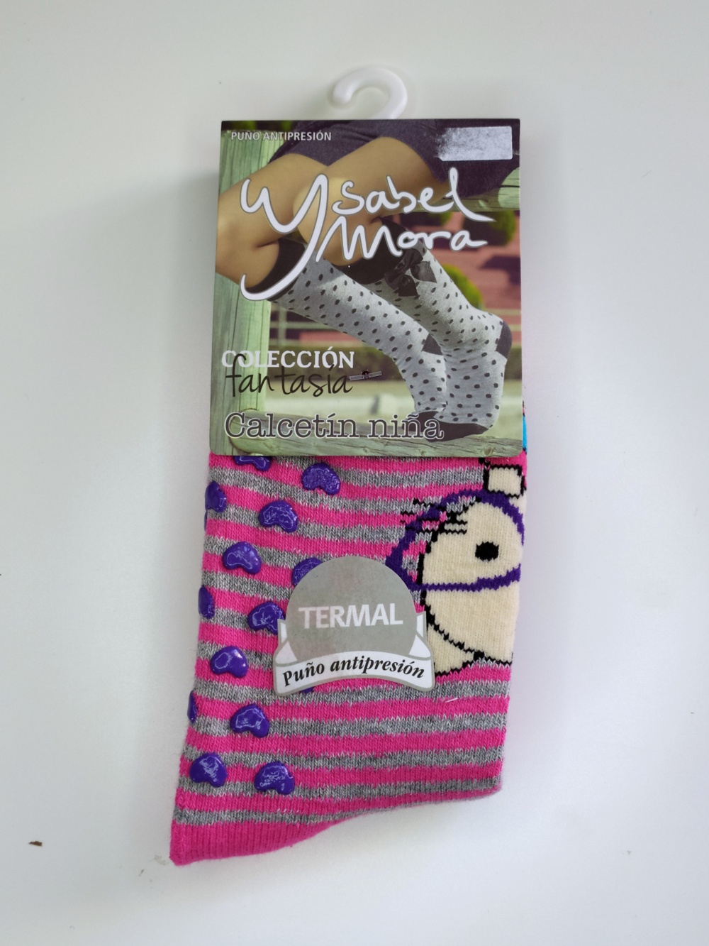Meias térmicas cor de rosa com riscas cinzentas e figura de animal para crianças