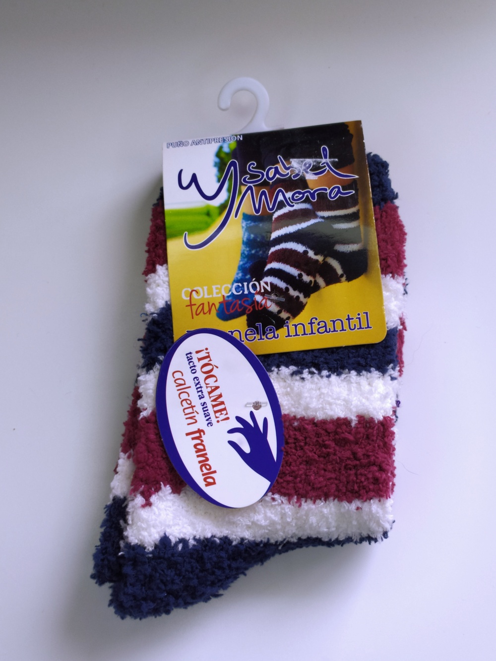 Meias infantis de tecido flanela com riscas azul, branca e vermelha e etiquetas penduradas