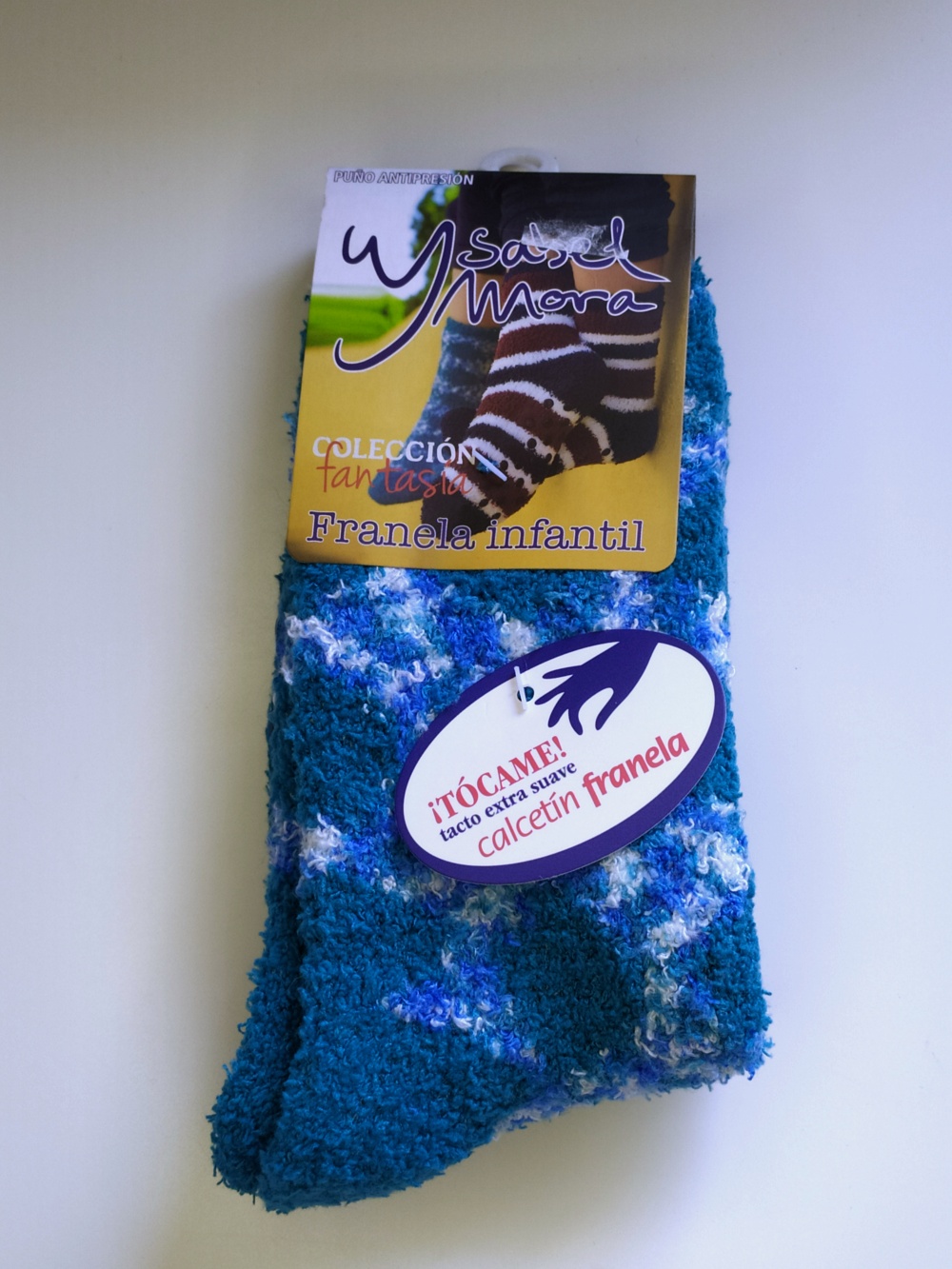 Meias de criança em flanela azul com padrão branco e roxo e etiquetas da marca Ysabel Mora