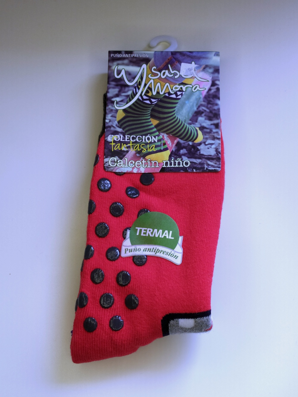 Meias vermelhas para criança com pontos antiderrapantes pretos e embalagem Ysabel Mora.