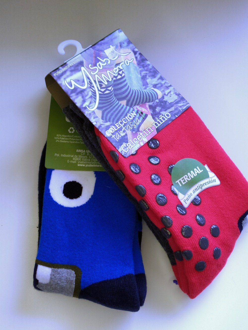 Meias infantis vermelha térmica com pontos pretos e azul com padrão branco e preto da marca Ysas Mara