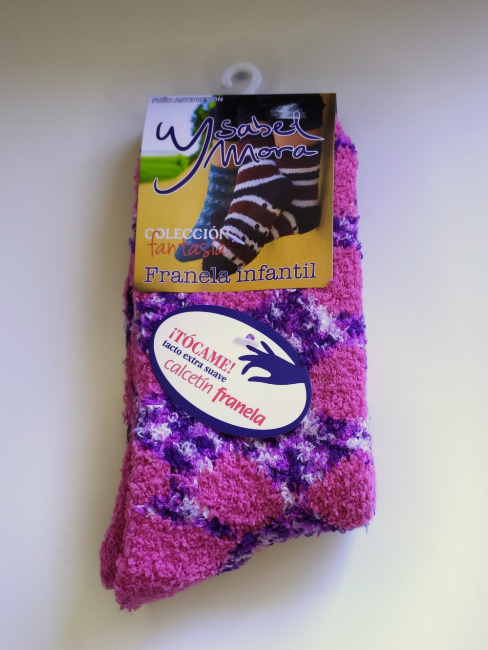 Meias infantis de flanela cor de rosa com padrão roxo e branco, embalagem Isabel Mora