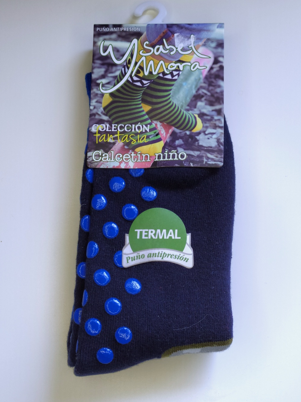 meias térmicas pretas com pontos antiderrapantes azuis para criança com etiqueta da marca Ysabel Mora