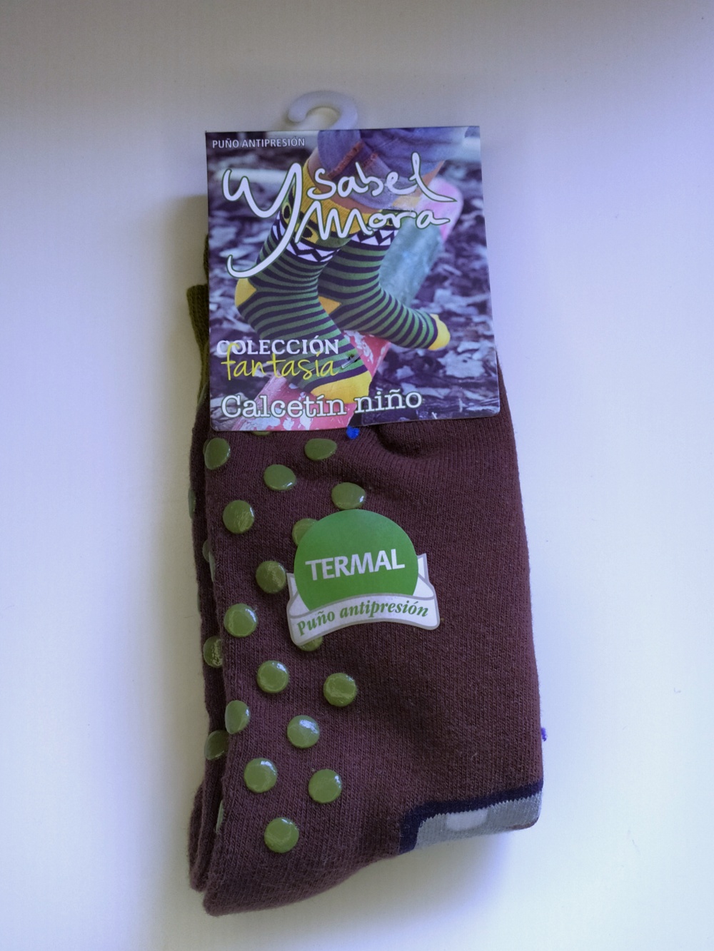 Meias castanhas de criança com bolinhas verdes e embalagem Isabel Mora