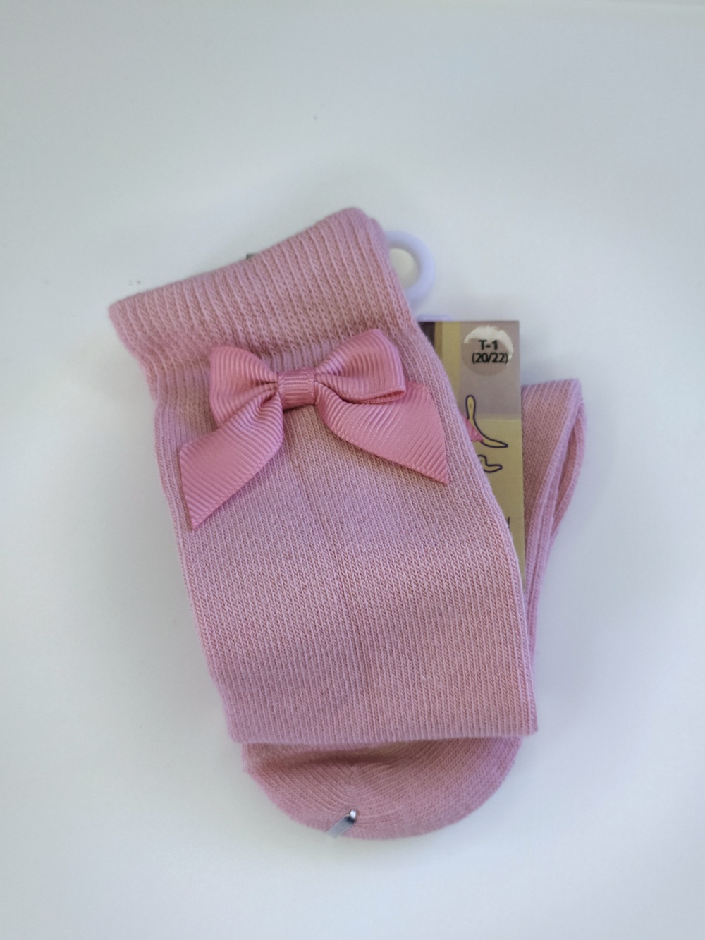 Meias de bebé cor-de-rosa com laço e etiqueta, sobre fundo branco.