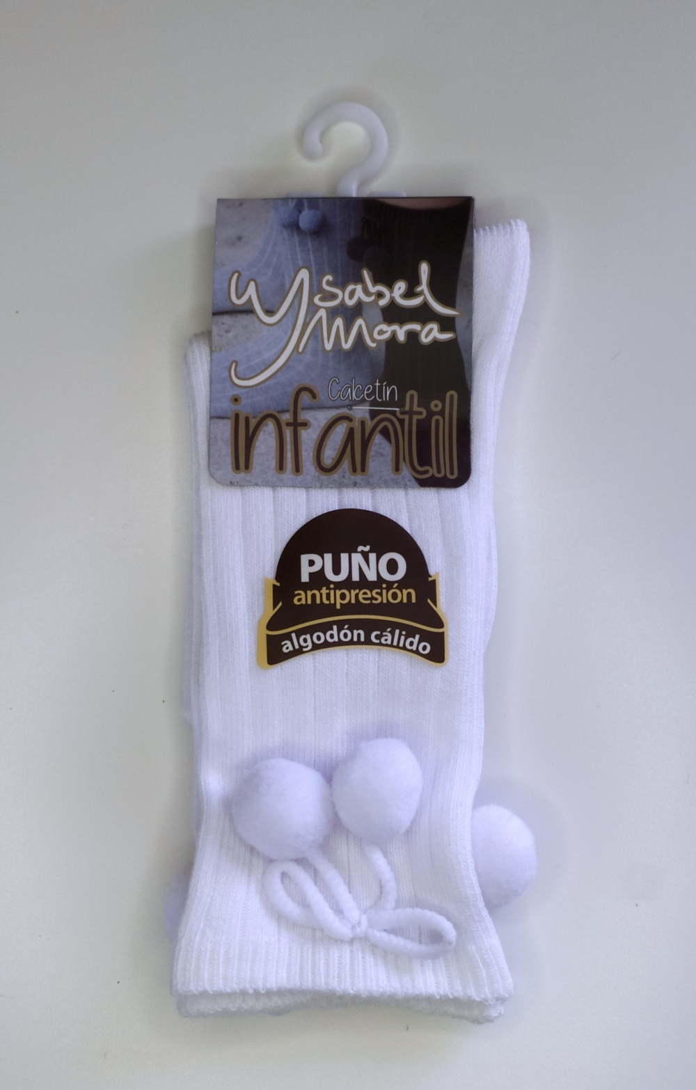 Meias infantis brancas com pompons e etiqueta Isabel Mora