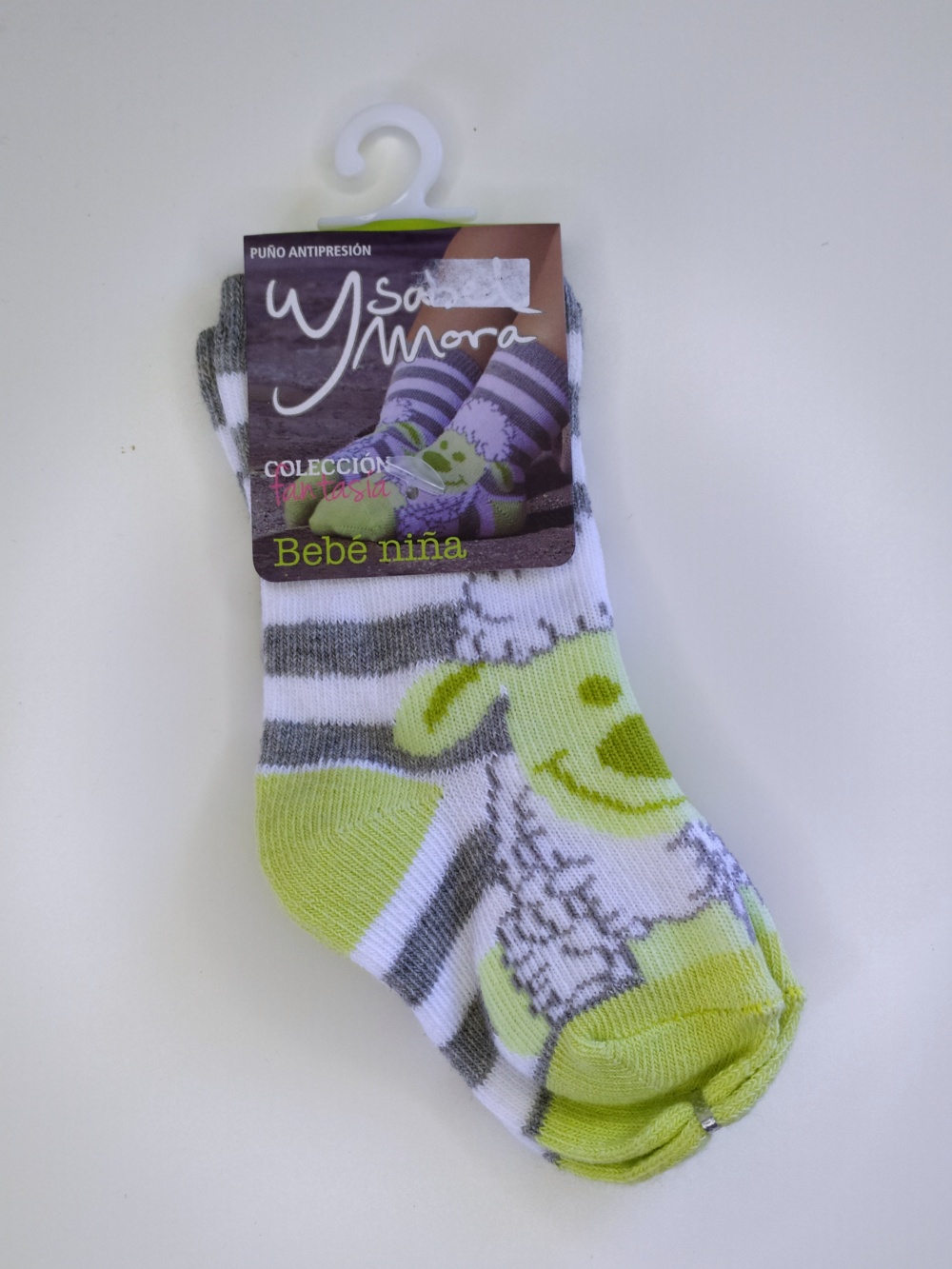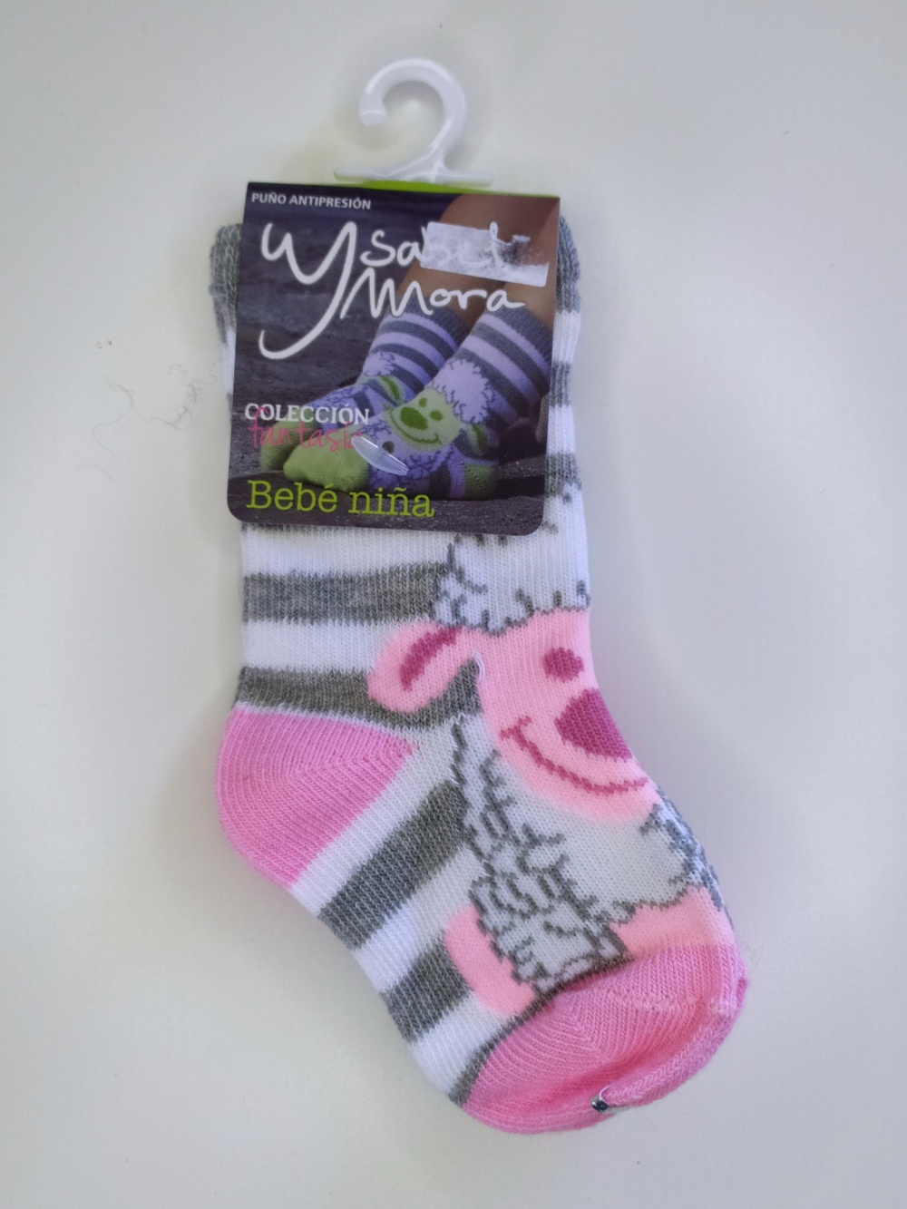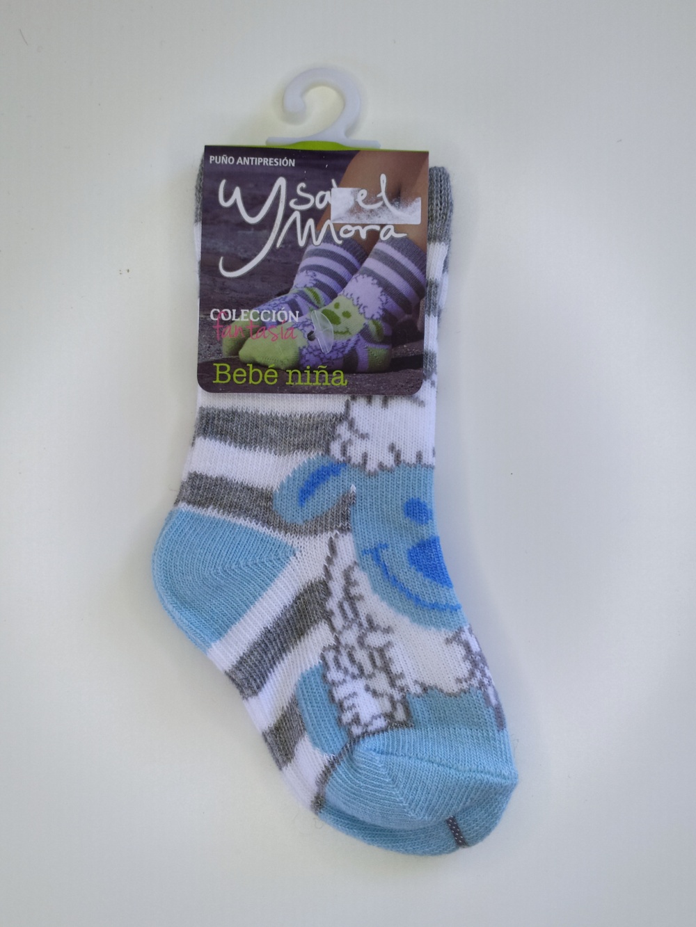 Meia para bebé menina cinza, branca e azul com desenho de animal