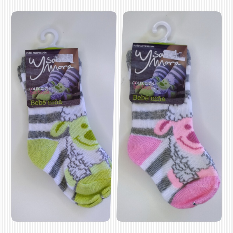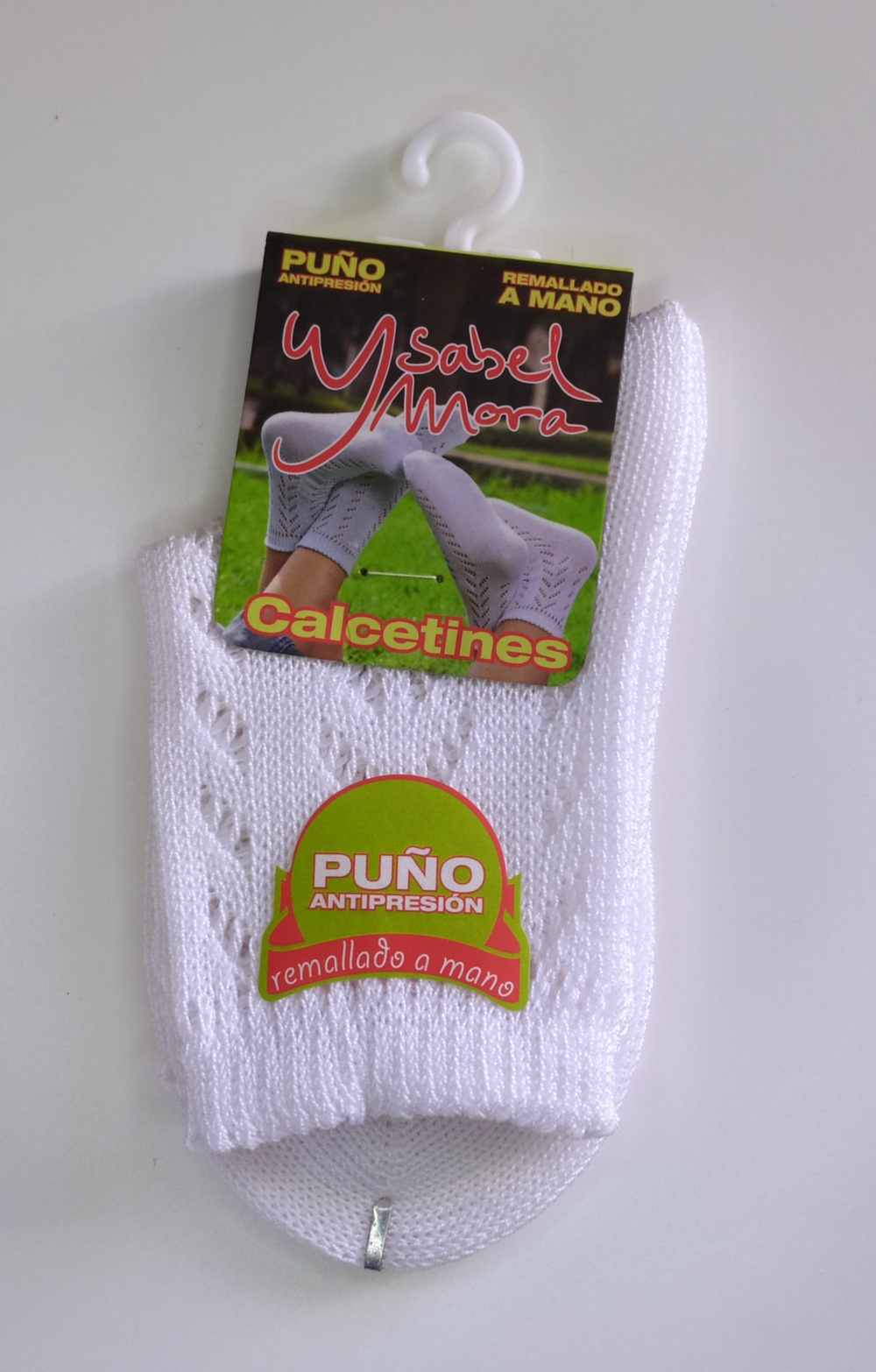 Meias brancas Isabel Mora com punho antipressão e remallado à mão em embalagem com etiqueta colorida
