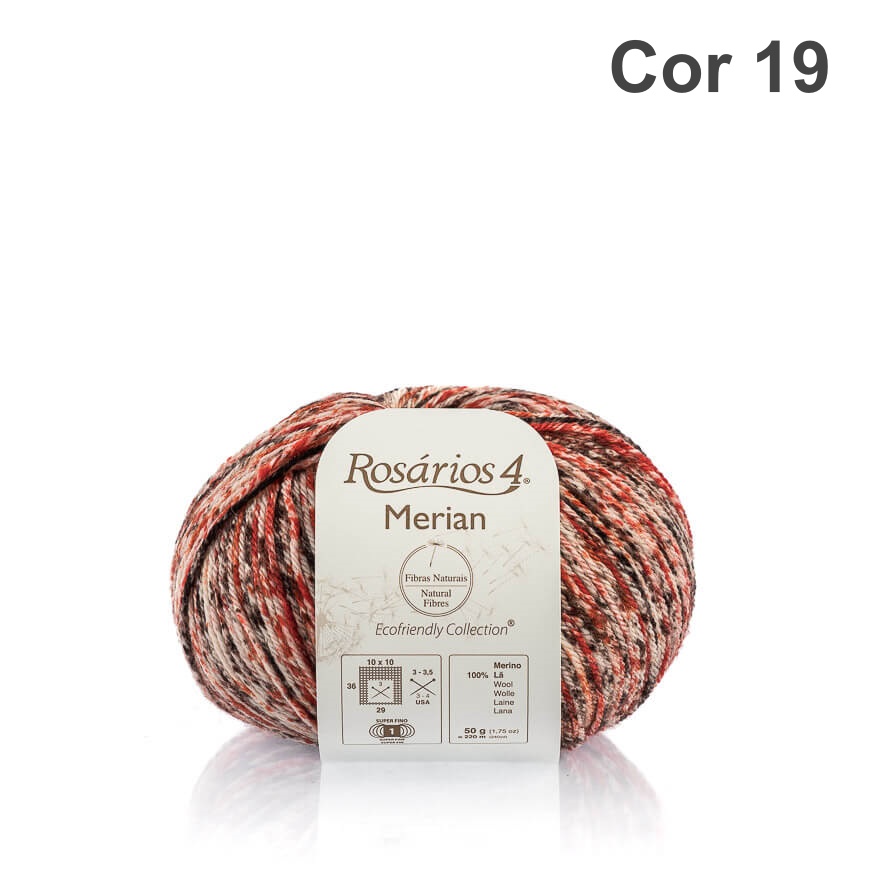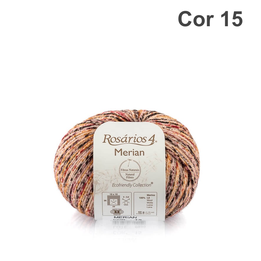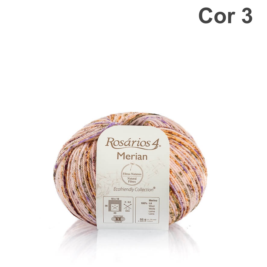 Novelo de lã multicolor em tons lilás, laranja e bege com etiqueta branca e texto Rosários 4. Merian