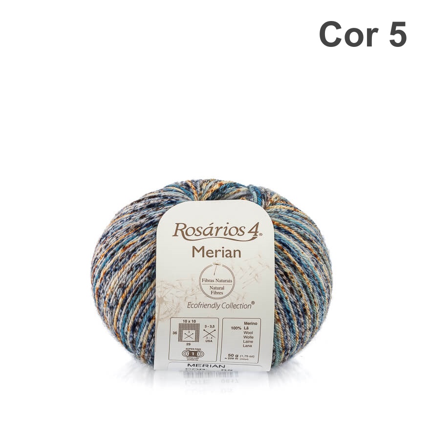 Novelo de lã multicolor azul, castanho, bege e cinzento com rótulo branco Rosários 4 Merian Cor 5