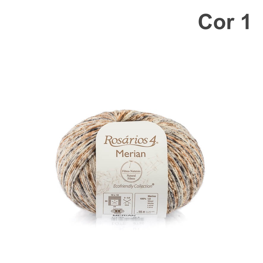 novelo de lã Rosários 4 Merian em tons bege, castanho e cinza com etiqueta branca