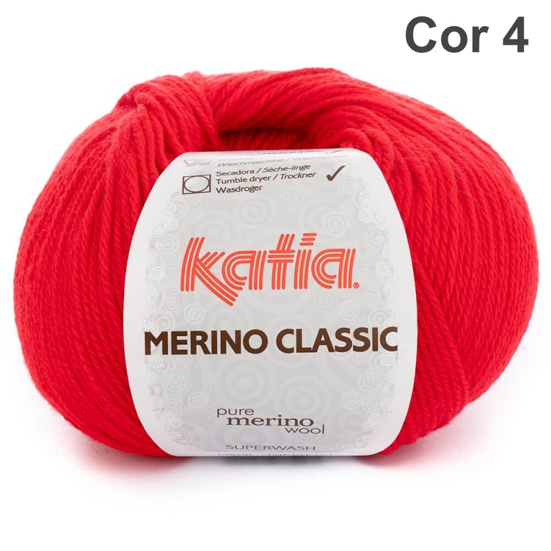 Novelo de lã vermelha Katia Merino Classic com etiqueta branca e texto em destaque