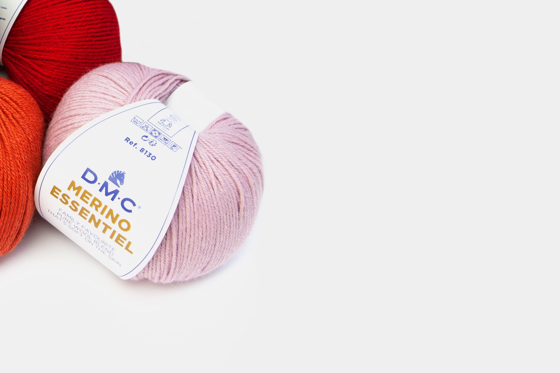 Novelo de lã rosa claro com rótulo DMC Merino Essentiel e outros novelos ao fundo