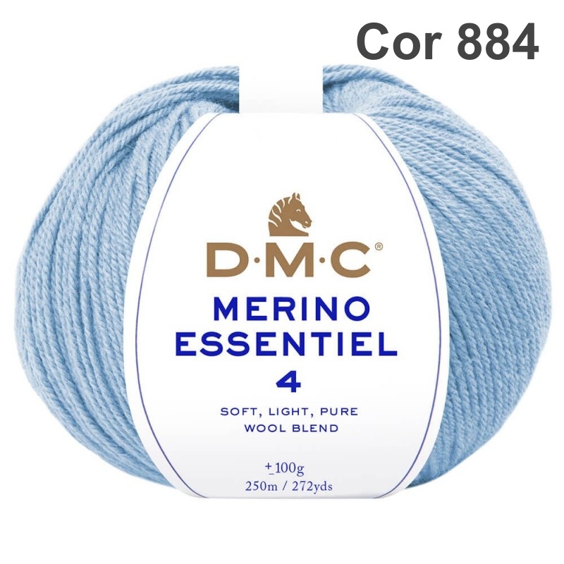 Novelo de fio azul claro DMC Merino Essentiel 4 com etiqueta