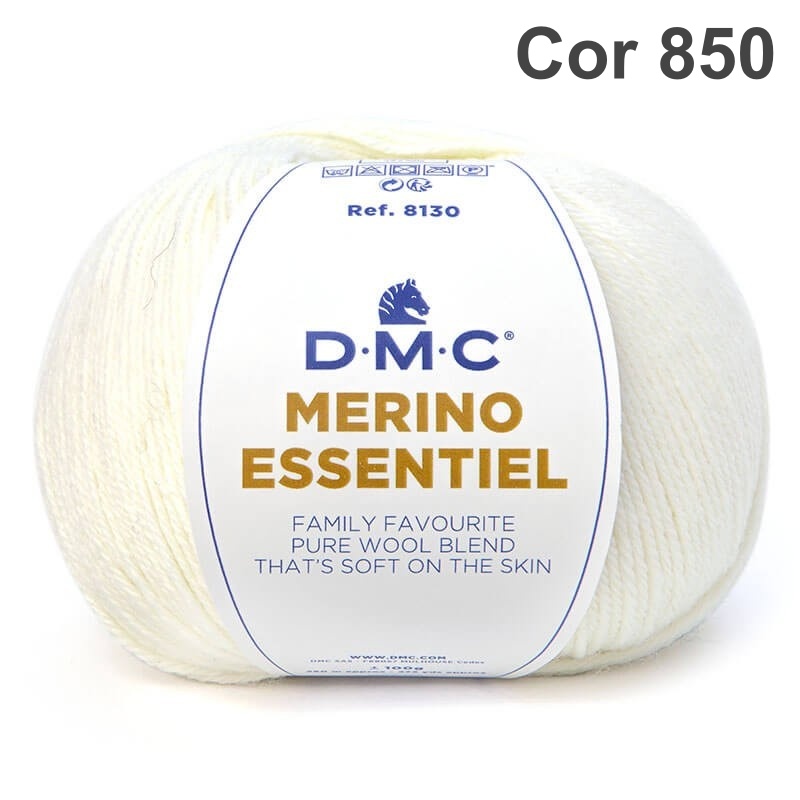 Novelo de lã merino branca D.M.C. Merino Essentiel com rótulo informativo
