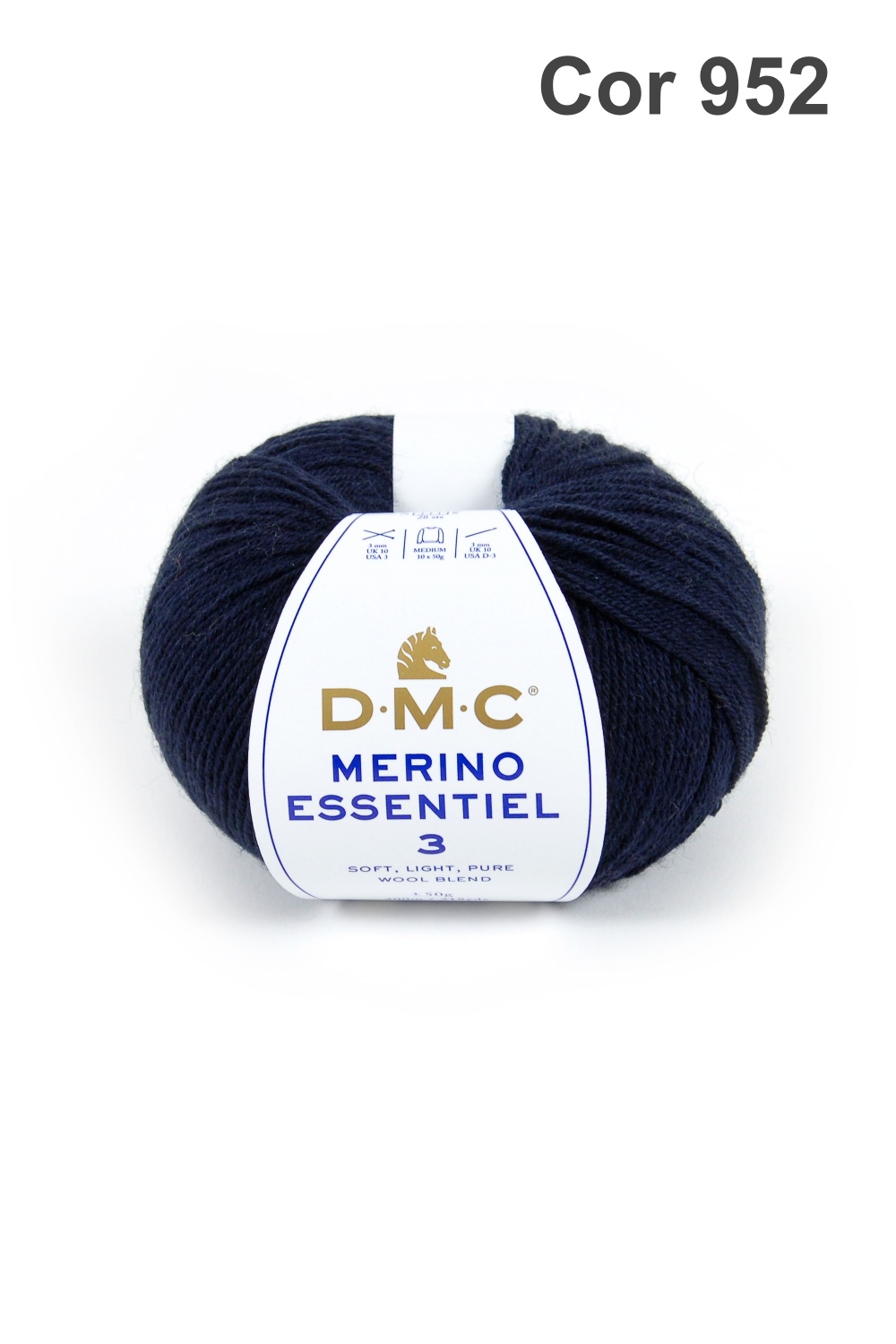 Novelo de lã azul escuro com etiqueta branca DMC MERINO ESSENTIEL 3