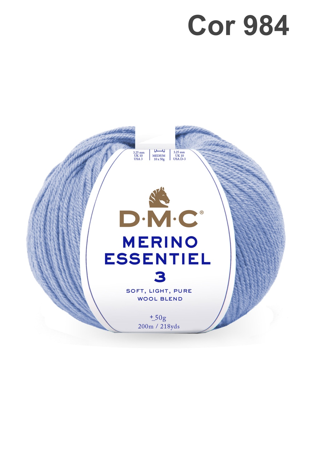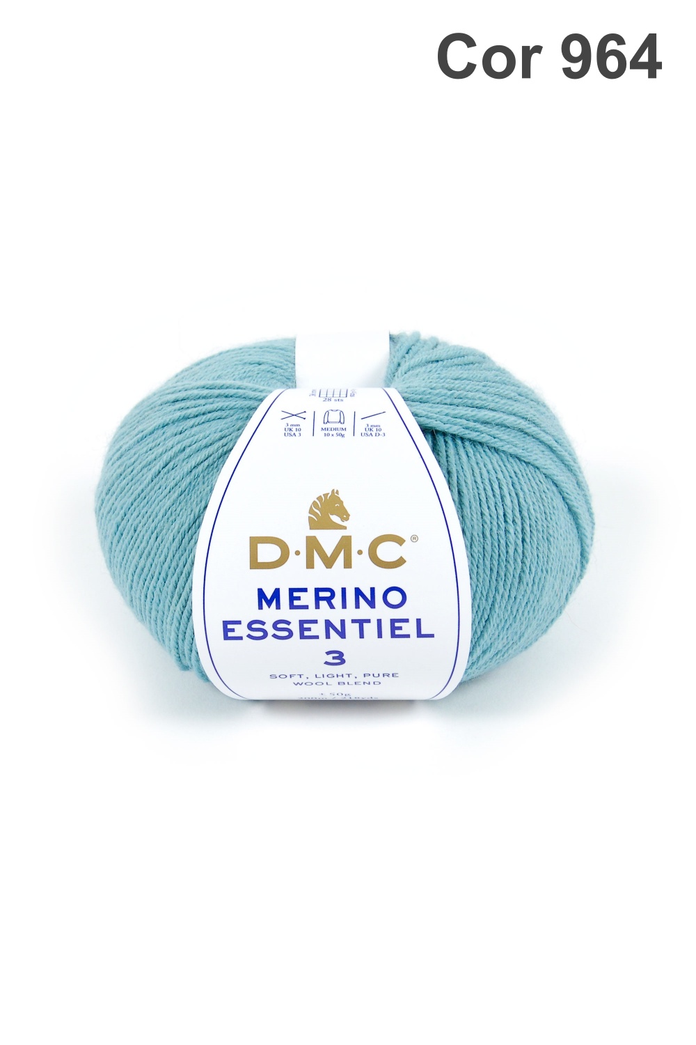 Novelo de lã azul clara D.M.C Merino Essentiel 3 com rótulo branco
