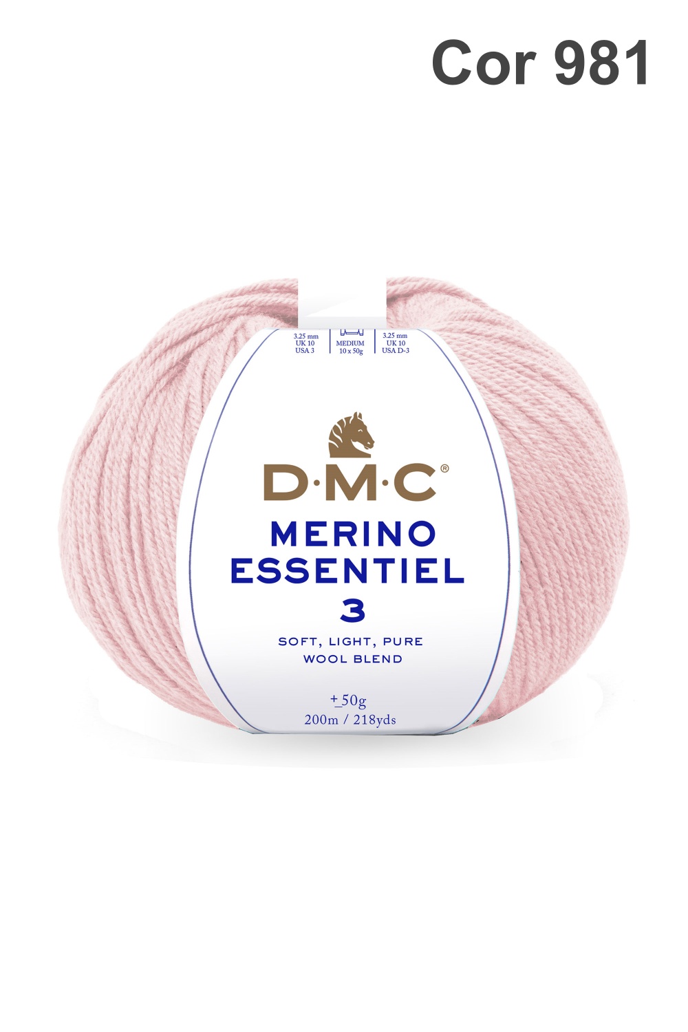 Novelo de lã cor-de-rosa claro com etiqueta da DMC Merino Essentiel 3