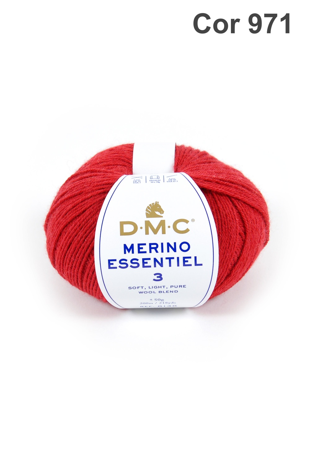 Novelo de lã vermelho D.M.C Merino Essentiel 3 com etiqueta branca e texto azul e dourado