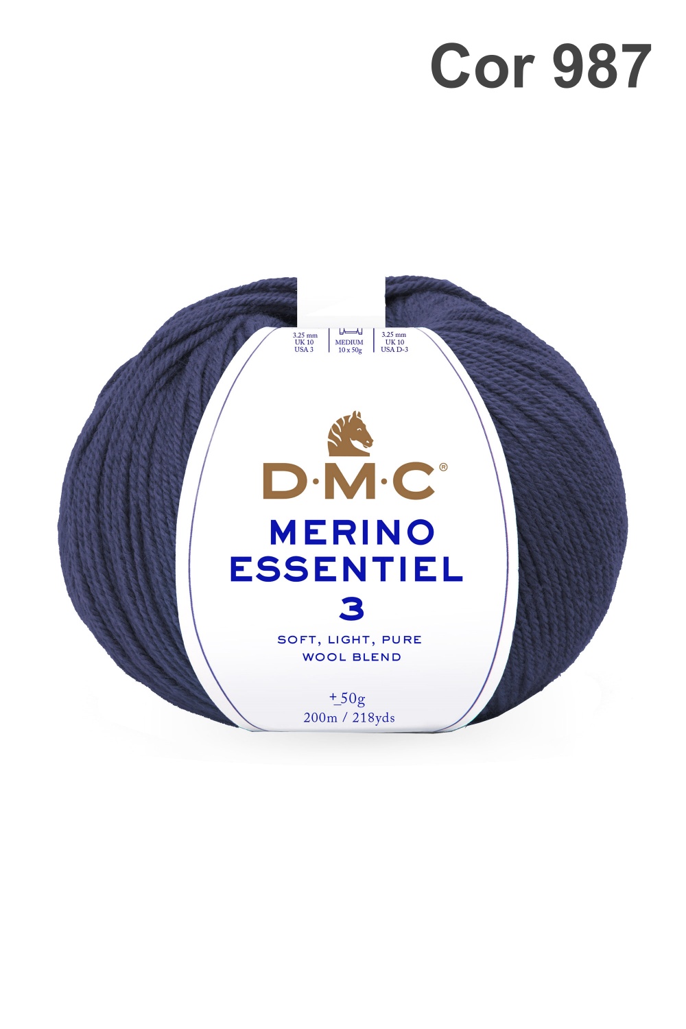 Novelo de lã azul escuro DMC Merino Essentiel 3 cor 987 com etiqueta