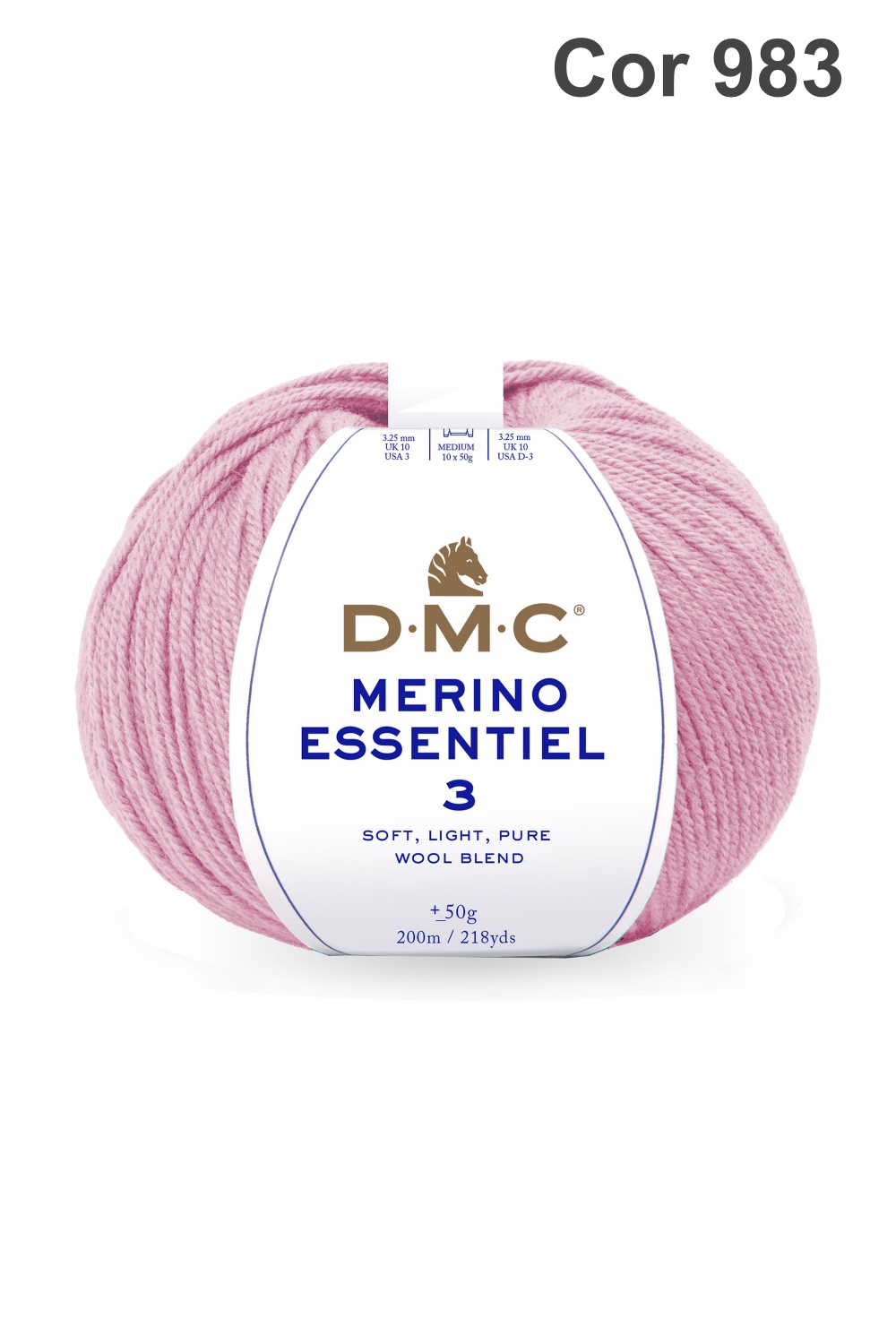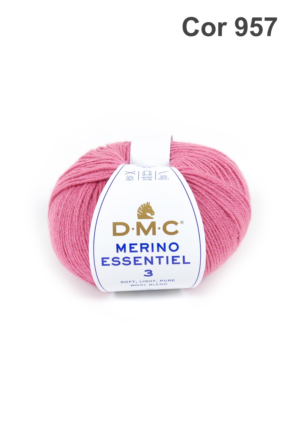 Novelo de lã cor-de-rosa D.M.C Merino Essentiel com rótulo branco e texto azul e dourado