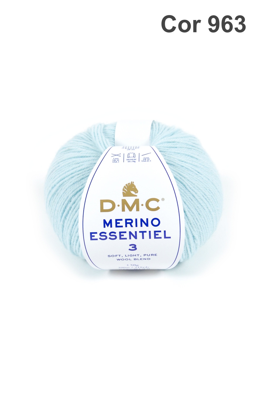 Novelo de lã azul claro DMC Merino Essentiel 3 com rótulo branco