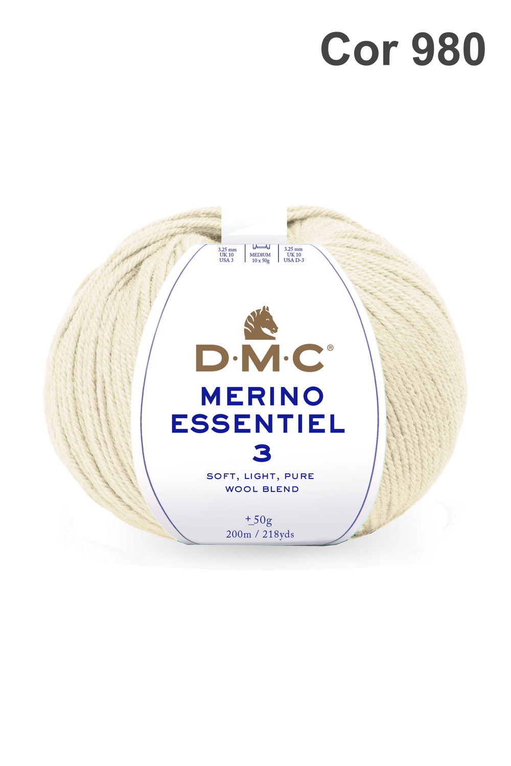 Novelo de lã creme DMC Merino Essentiel 3 com etiqueta branca e texto azul e castanho