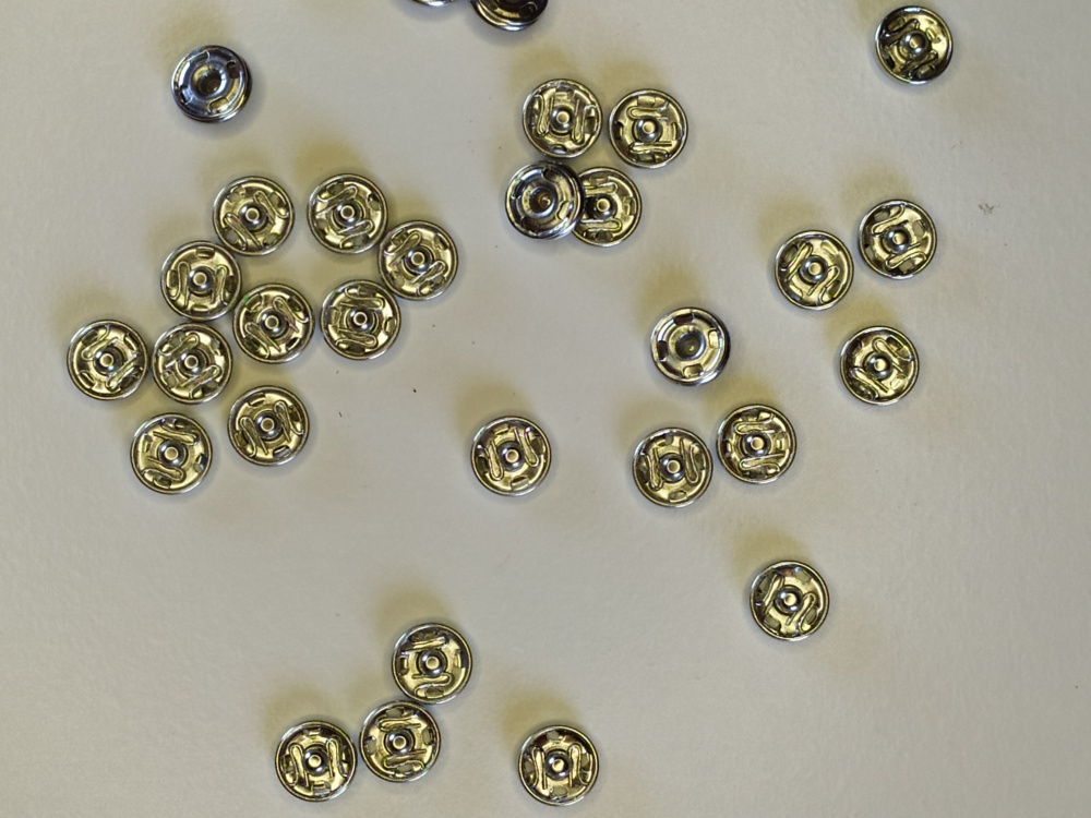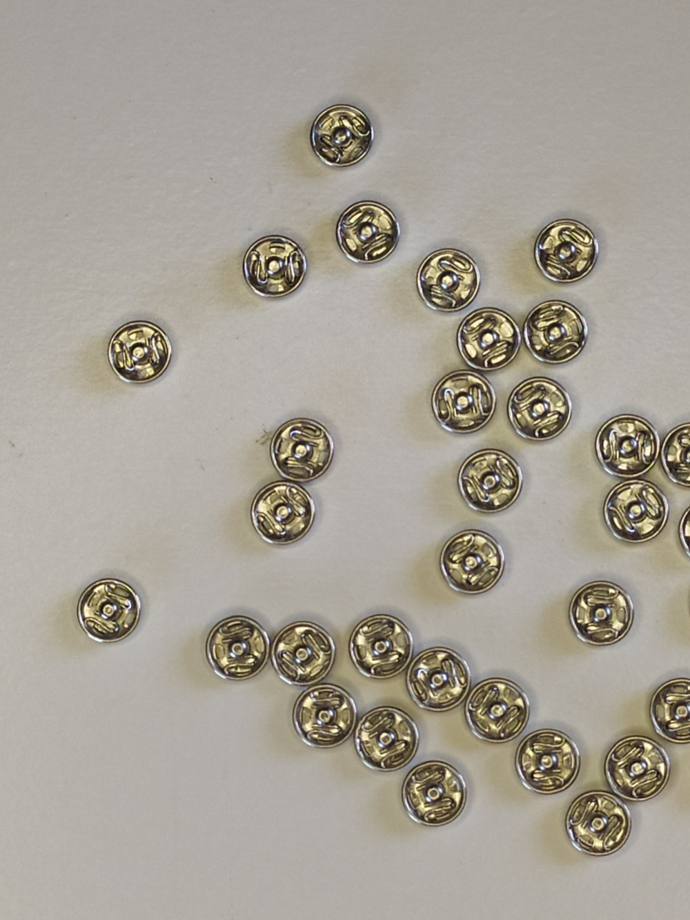 Botões de pressão metálicos prateados espalhados sobre fundo branco
