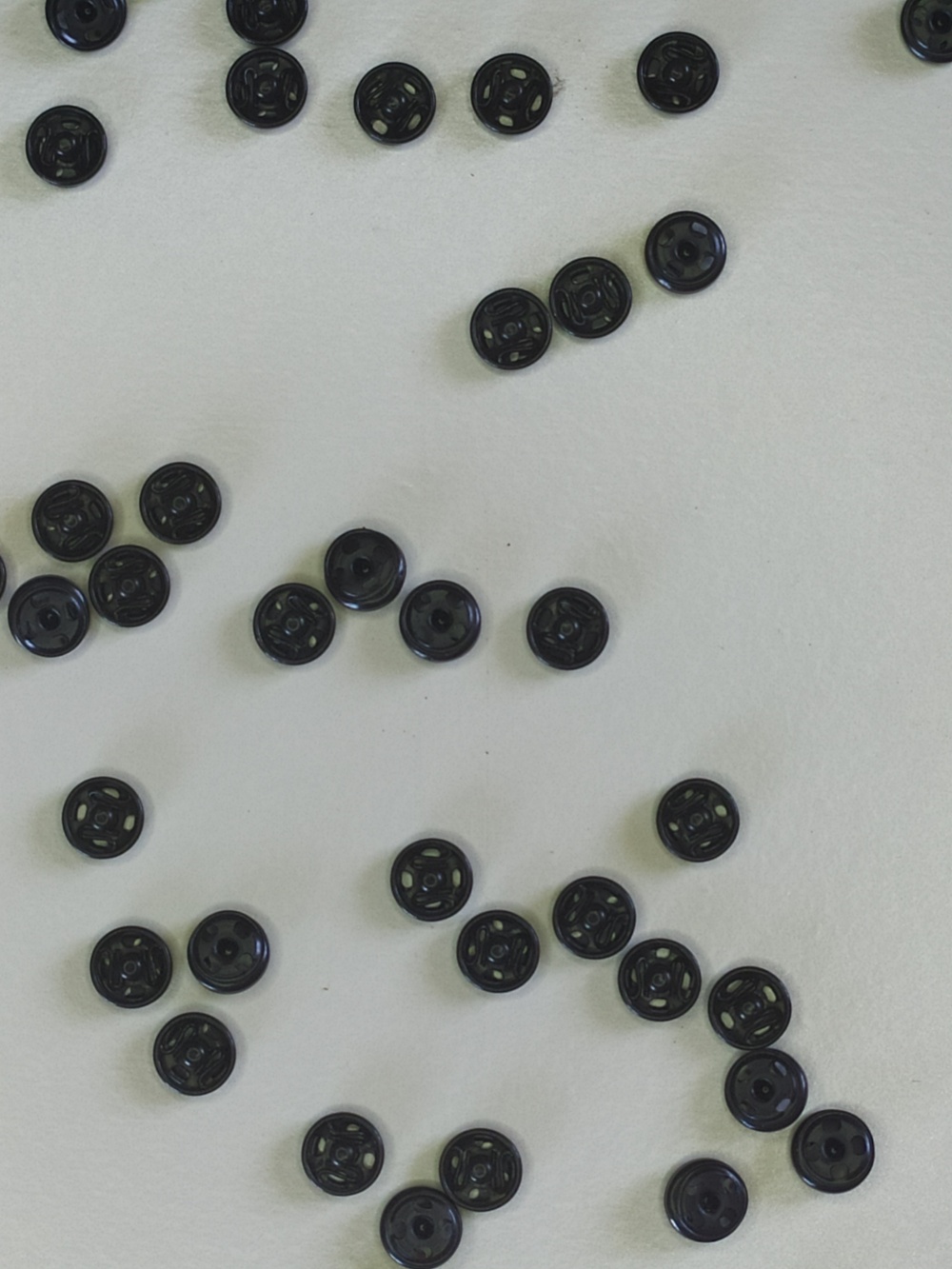 Botões pretos redondos de plástico sobre superfície branca