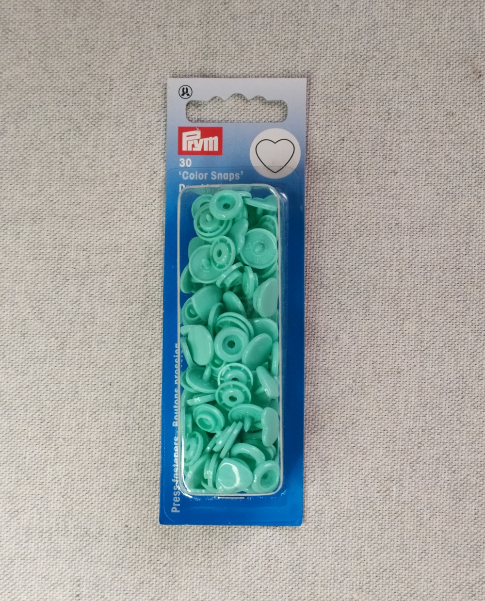 Pacote de botões de pressão verdes da marca Prym em embalagem azul sobre tecido cinza