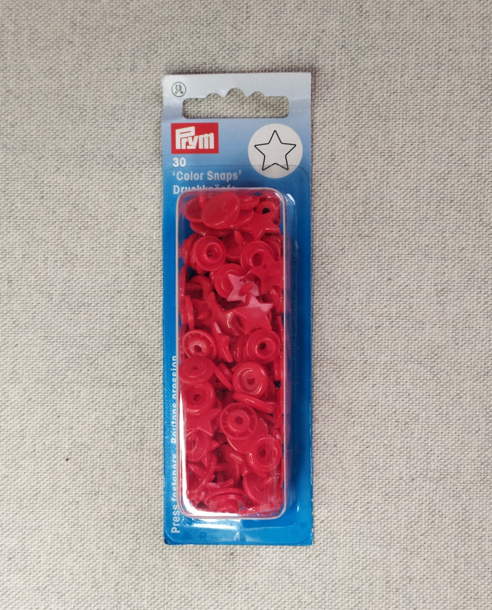 Pacote de botões de pressão vermelhos PRYM sobre tecido bege