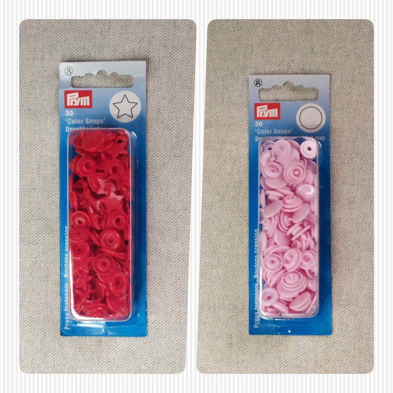 Pacotes de botões de pressão vermelhos e cor-de-rosa da marca PRYM sobre tecido bege