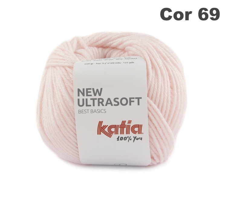 Novelo de lã rosa claro com etiqueta katia e texto Cor 69