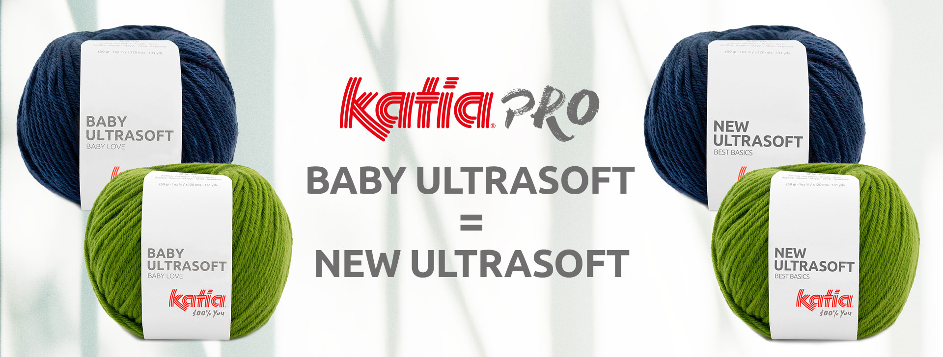 Novelos de lã Katia Pro em azul escuro e verde com etiquetas. Texto Katia Pro Baby Ultrasoft = New Ultrasoft.