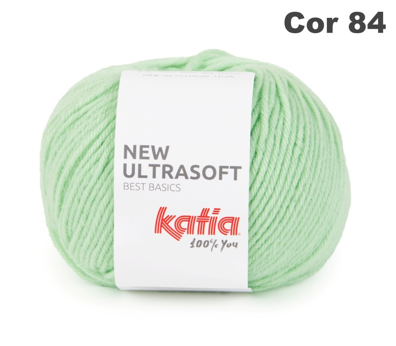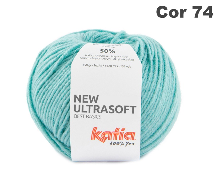 Novelo de lã azul turquesa com etiqueta branca Katia New Ultrasoft