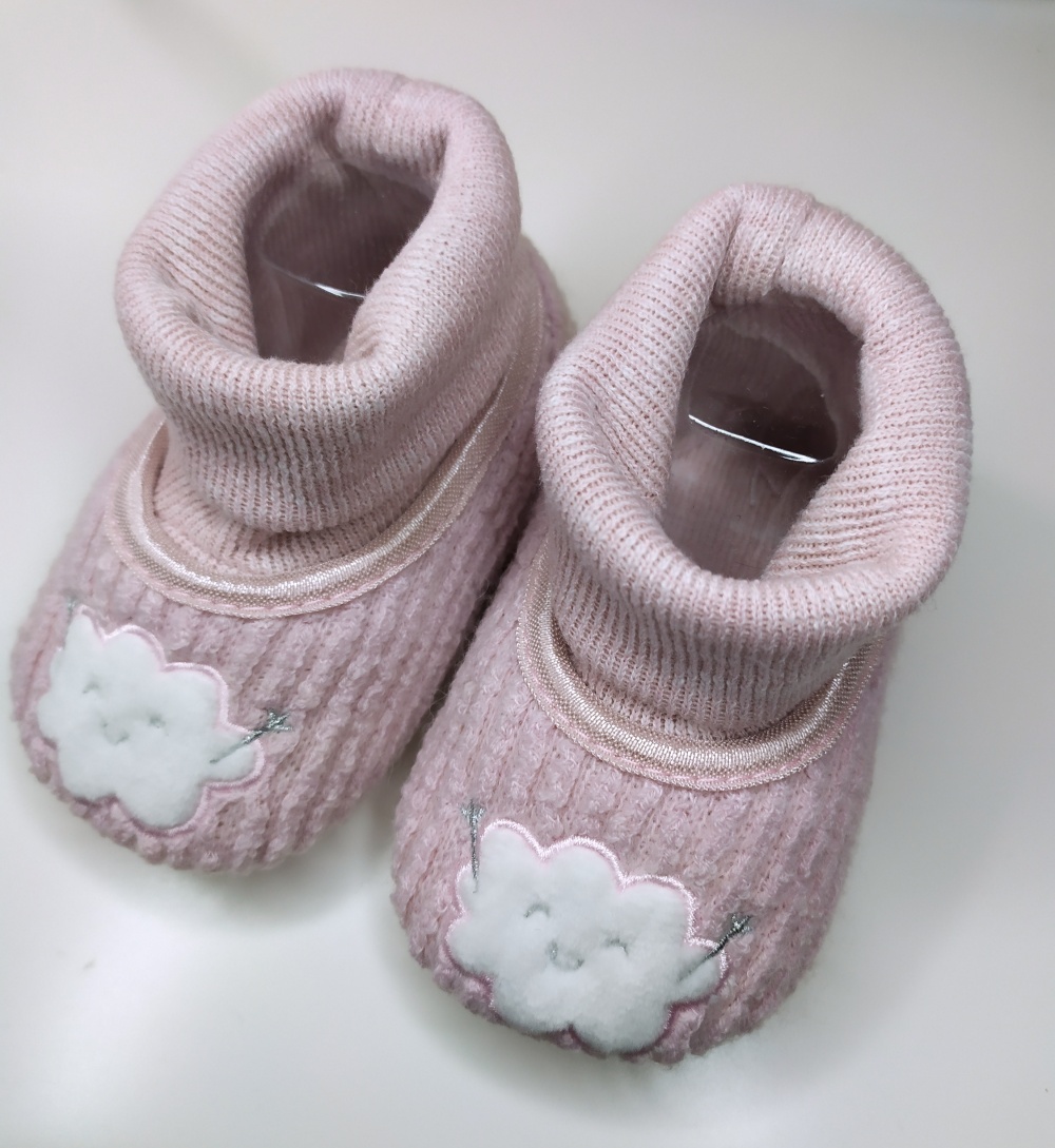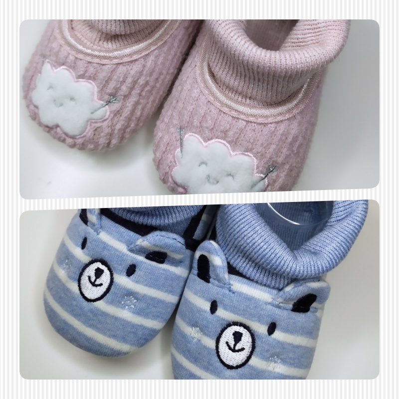 Dois pares de sapatinhos de bebé cor de rosa e azul, com padrões de nuvem e urso.