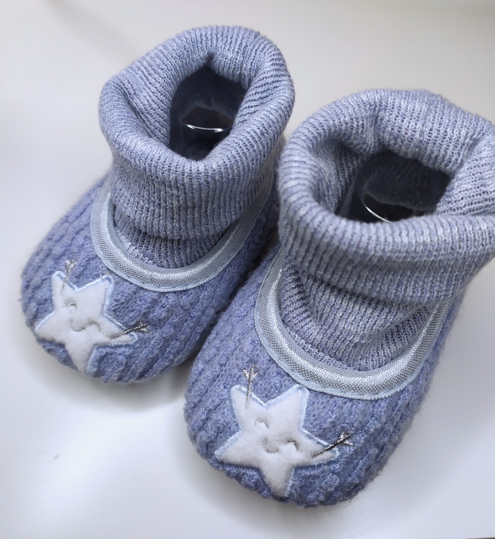 Sapatilhas de bebé cinzentas com estrela branca bordada na frente.