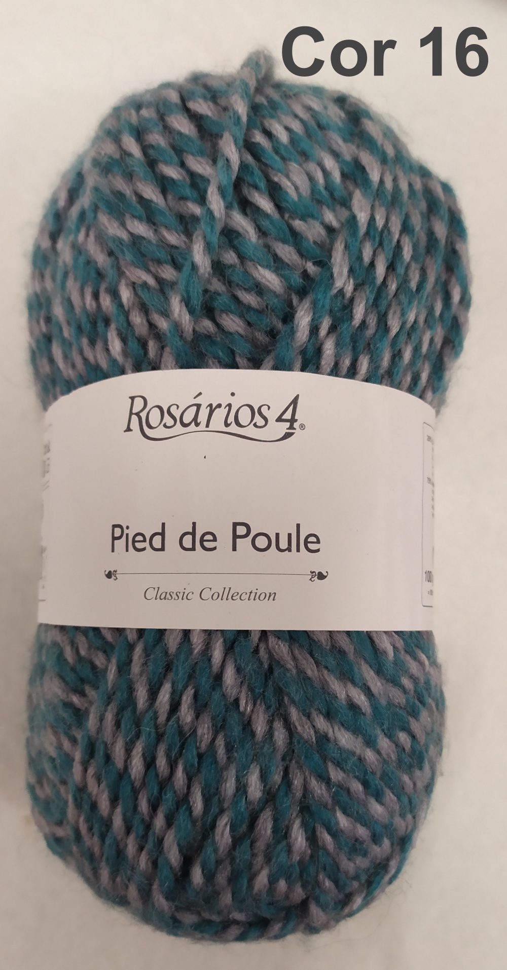 Novelo de lã Rosários 4 Pied de Poule azul e cinza com etiqueta branca