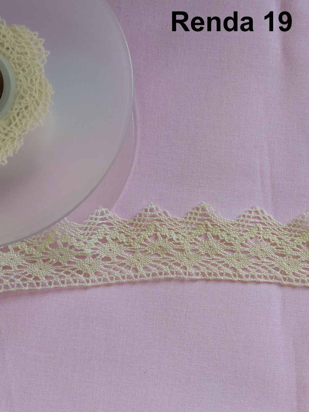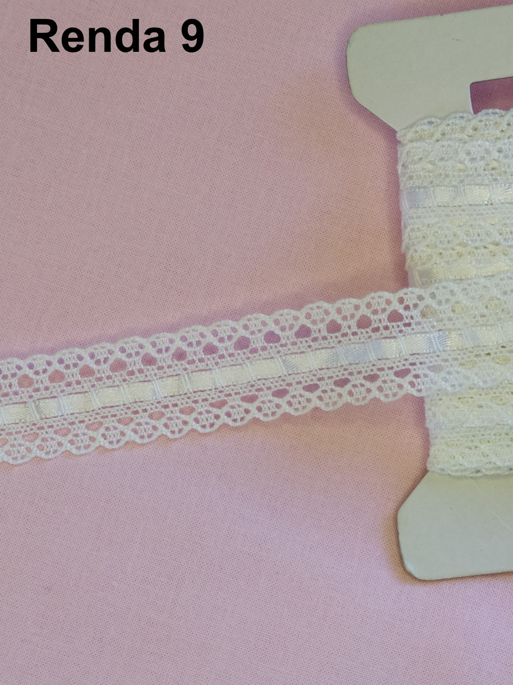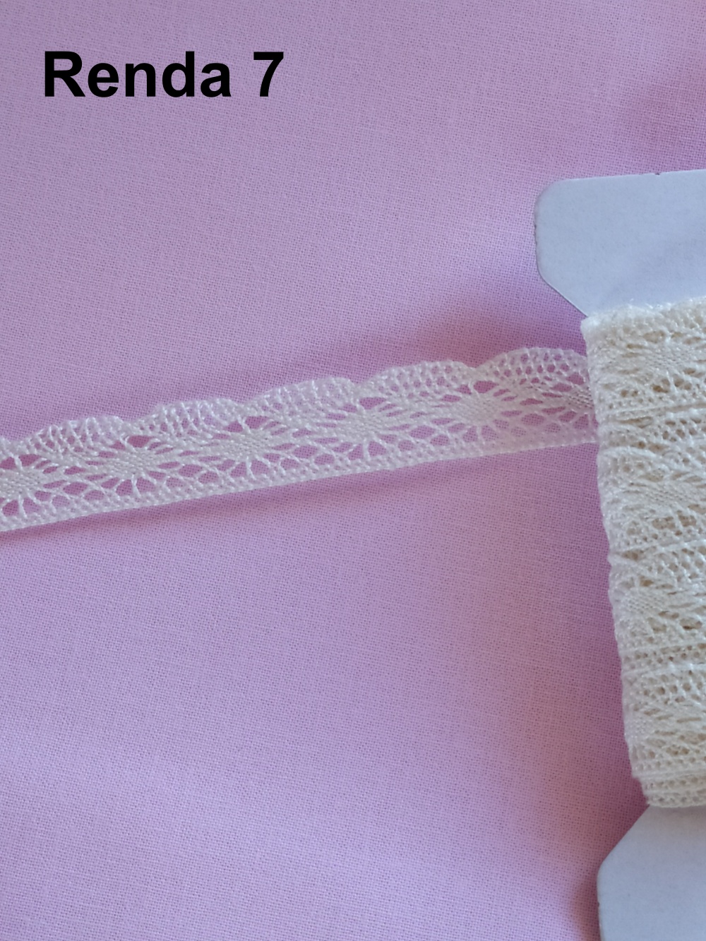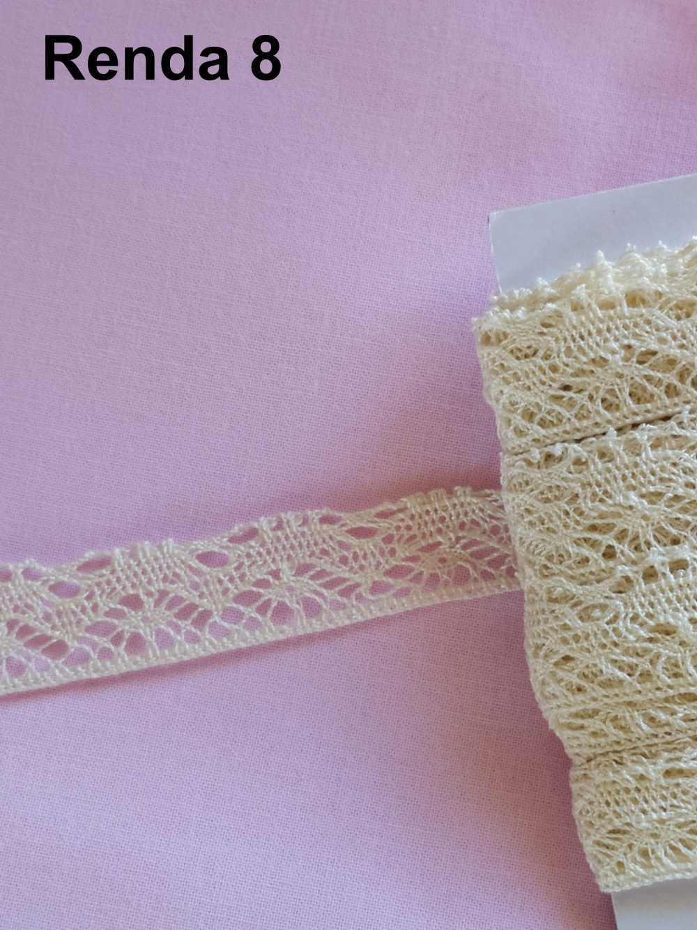 Renda creme em cartão sobre fundo rosa com texto 'Renda 8'.