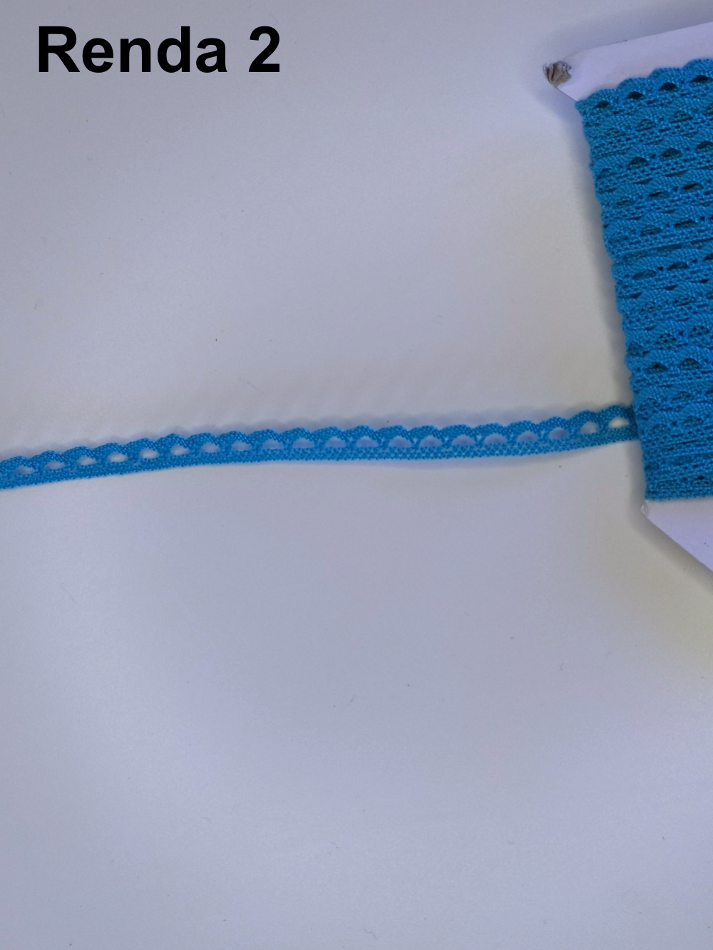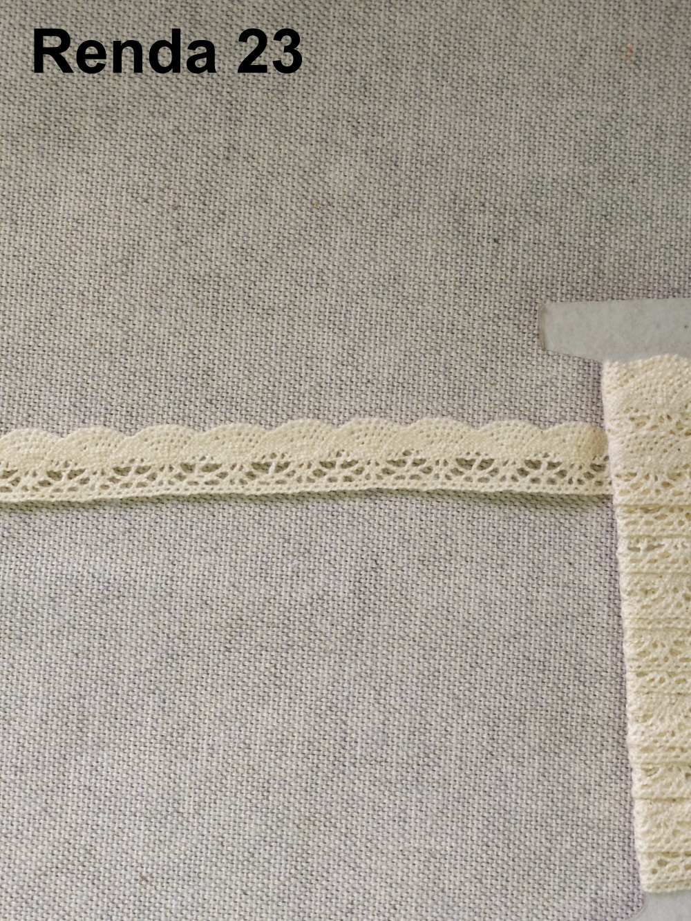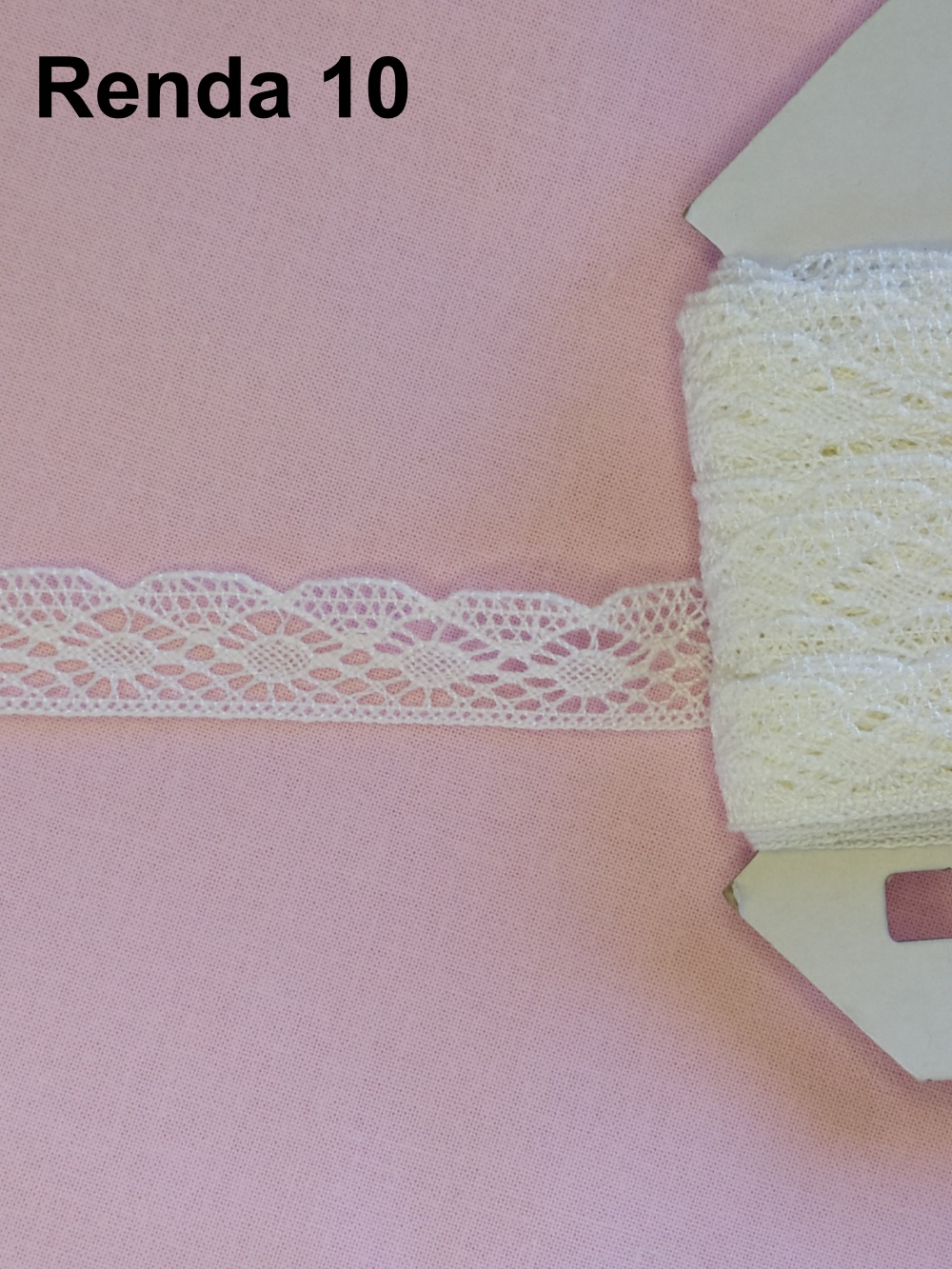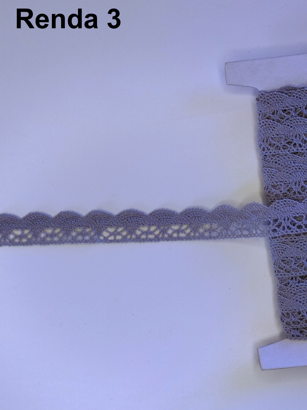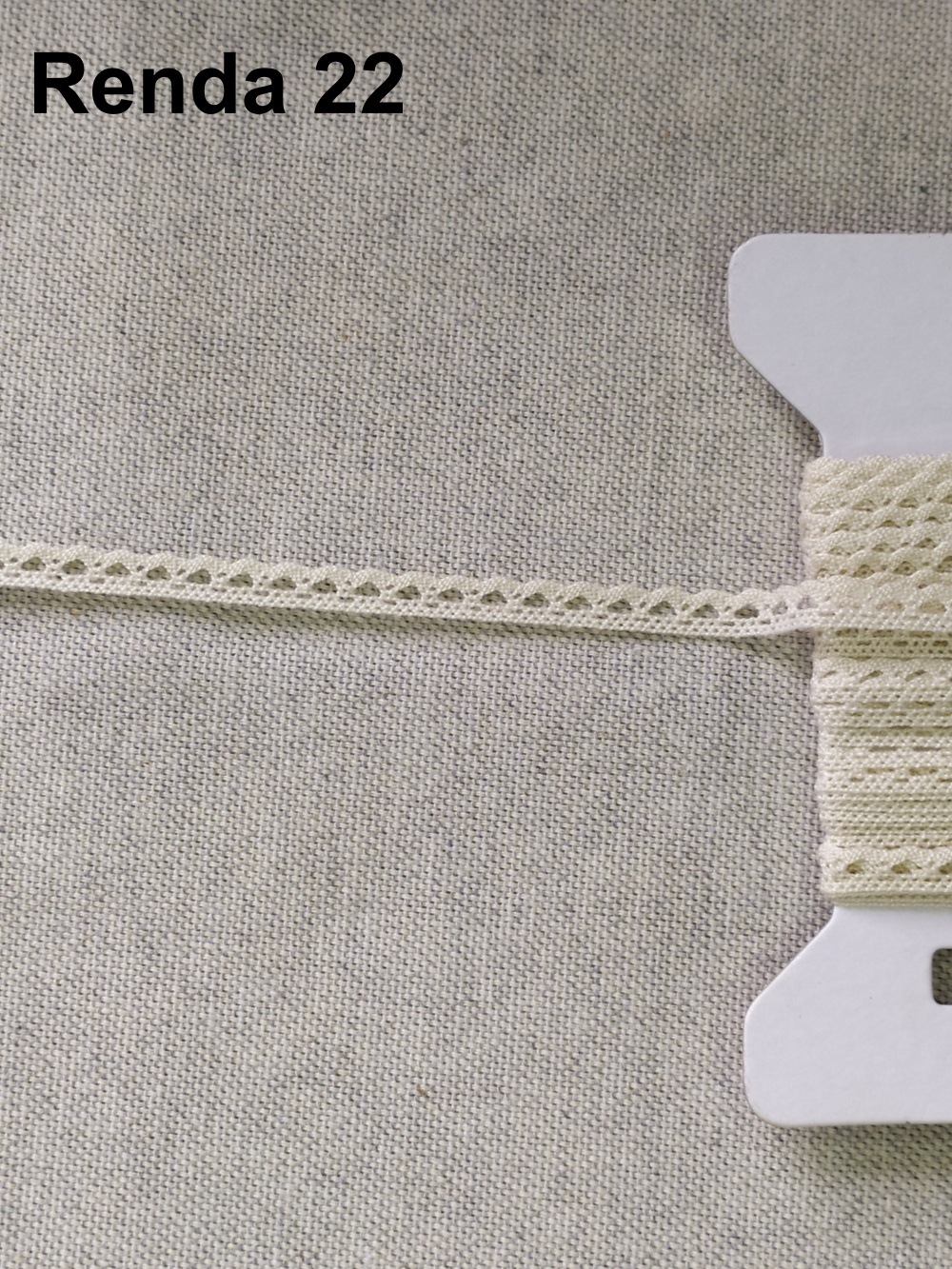 Renda branca fina em cartão sobre fundo cinza com texto Renda 22