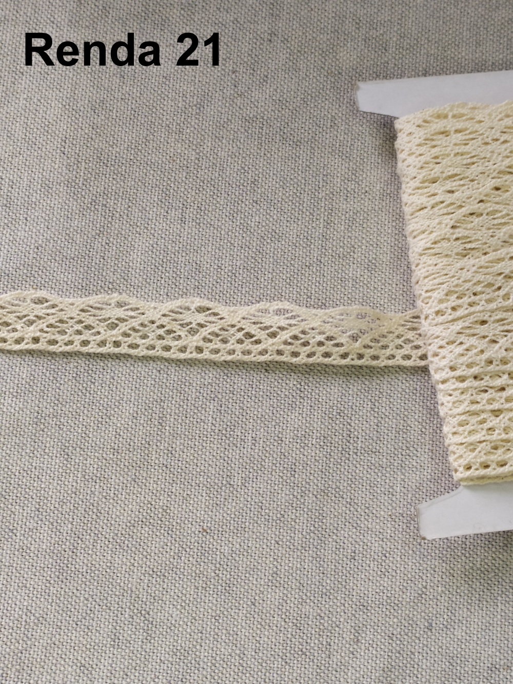 Renda bege entrelaçada em cartão branco sobre tecido cinza com texto Renda 21